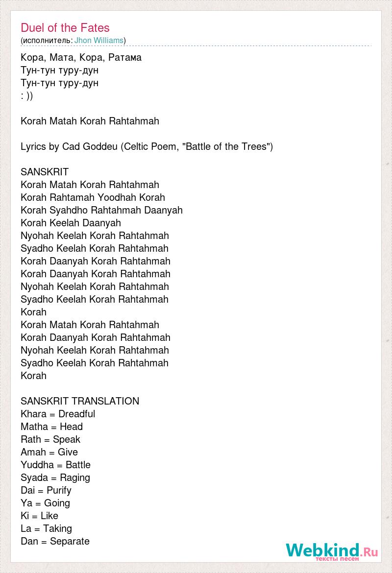 Кора, Мата, Кора, Ратама Тун-тун туру-дун Тун-тун туру-дун : )) Korah Matah Korah Rahtahmah Lyrics by Cad Goddeu (Celtic Poem, "Battle of the Trees") SANSKRIT Korah Matah Korah Rahtahmah Korah Rahtamah Yoodhah Korah Korah Syahdho Rahtahmah Daanyah Korah Keelah Daanyah Nyohah Keelah Korah Rahtahmah Syadho Keelah Korah Rahtahmah Korah Daanyah Korah Rahtahmah Korah Daanyah Korah Rahtahmah Nyohah Keelah Korah Rahtahmah Syadho Keelah Korah Rahtahmah Korah Korah Matah Korah Rahtahmah Korah Daanyah Korah Rahtahmah Nyohah Keelah Korah Rahtahmah Syadho Keelah Korah Rahtahmah Korah SANSKRIT TRANSLATION Khara = Dreadful Matha = Head Rath = Speak Amah = Give Yuddha = Battle Syada = Raging Dai = Purify Ya = Going Ki = Like La = Taking Dan = Separate