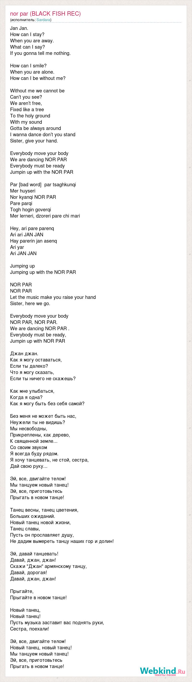 Jan Jan. How can I stay? When you are away. What can I say? If you gonna tell me nothing. How can I smile? When you are alone. How can I be without me? Without me we cannot be Can’t you see? We aren’t free, Fixed like a tree To the holy ground With my sound Gotta be always around I wanna dance don’t you stand Sister, give your hand. Everybody move your body We are dancing NOR PAR Everybody must be ready Jumpin up with the NOR PAR Par [bad word] par tsaghkunqi Mer huyseri Nor kyanqi NOR PAR Pare parqi Togh hogin goverqi Mer lerneri, dzoreri pare chi mari Hey, ari pare parenq Ari ari JAN JAN Hay parerin jan asenq Ari yar Ari JAN JAN Jumping up Jumping up with the NOR PAR NOR PAR NOR PAR Let the music make you raise your hand Sister, here we go. Everybody move your body NOR PAR, NOR PAR. We are dancing NOR PAR . Everybody must be ready, Jumpin up with NOR PAR Джан джан. Как я могу оставаться, Если ты далеко? Что я могу сказать, Если ты ничего не скажешь? Как мне улыбаться, Когда я одна? Как я могу быть без себя самой? Без меня не может быть нас, Неужели ты не видишь? Мы несвободны, Прикреплены, как дерево, К священной земле... Со своим звуком Я всегда буду рядом. Я хочу танцевать, не стой, сестра, Дай свою руку... Эй, все, двигайте телом! Мы танцуем новый танец! Эй, все, приготовьтесь Прыгать в новом танце! Танец весны, танец цветения, Больших ожиданий. Новый танец новой жизни, Танец славы, Пусть он прославляет душу, Не дадим вымереть танцу наших гор и долин! Эй, давай танцевать! Давай, джан, джан! Скажи "Джан" армянскому танцу, Давай, дорогая! Давай, джан, джан! Прыгайте, Прыгайте в новом танце! Новый танец, Новый танец! Пусть музыка заставит вас поднять руки, Сестра, поехали! Эй, все, двигайте телом! Новый танец, новый танец! Мы танцуем новый танец! Эй, все, приготовьтесь Прыгать в новом танце!