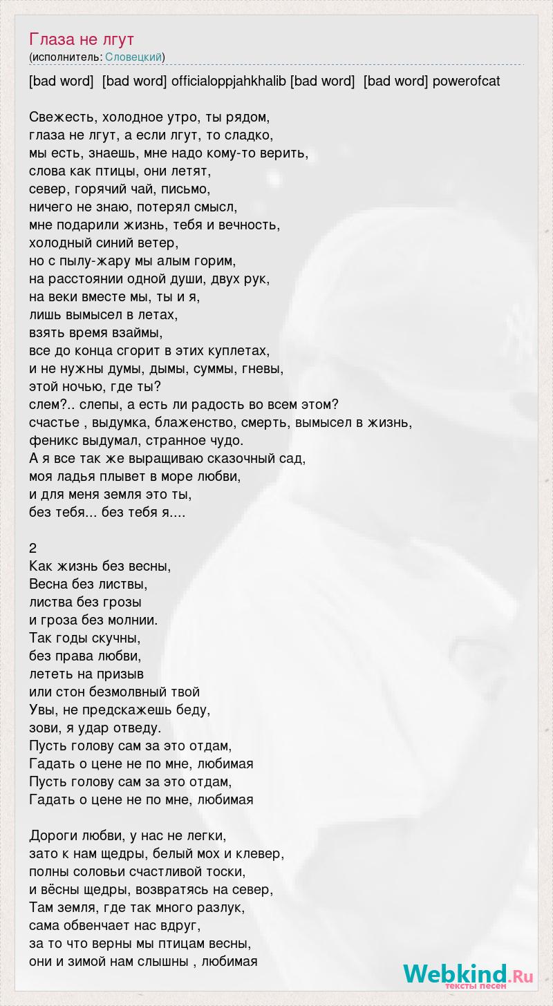 [bad word] [bad word] officialoppjahkhalib [bad word] [bad word] powerofcat Свежесть, холодное утро, ты рядом, глаза не лгут, а если лгут, то сладко, мы есть, знаешь, мне надо кому-то верить, слова как птицы, они летят, север, горячий чай, письмо, ничего не знаю, потерял смысл, мне подарили жизнь, тебя и вечность, холодный синий ветер, но с пылу-жару мы алым горим, на расстоянии одной души, двух рук, на веки вместе мы, ты и я, лишь вымысел в летах, взять время взаймы, все до конца сгорит в этих куплетах, и не нужны думы, дымы, суммы, гневы, этой ночью, где ты? слем?.. слепы, а есть ли радость во всем этом? счастье , выдумка, блаженство, смерть, вымысел в жизнь, феникс выдумал, странное чудо. А я все так же выращиваю сказочный сад, моя ладья плывет в море любви, и для меня земля это ты, без тебя... без тебя я.... 2 Как жизнь без весны, Весна без листвы, листва без грозы и гроза без молнии. Так годы скучны, без права любви, лететь на призыв или стон безмолвный твой Увы, не предскажешь беду, зови, я удар отведу. Пусть голову сам за это отдам, Гадать о цене не по мне, любимая Пусть голову сам за это отдам, Гадать о цене не по мне, любимая Дороги любви, у нас не легки, зато к нам щедры, белый мох и клевер, полны соловьи счастливой тоски, и вёсны щедры, возвратясь на север, Там земля, где так много разлук, сама обвенчает нас вдруг, за то что верны мы птицам весны, они и зимой нам слышны , любимая