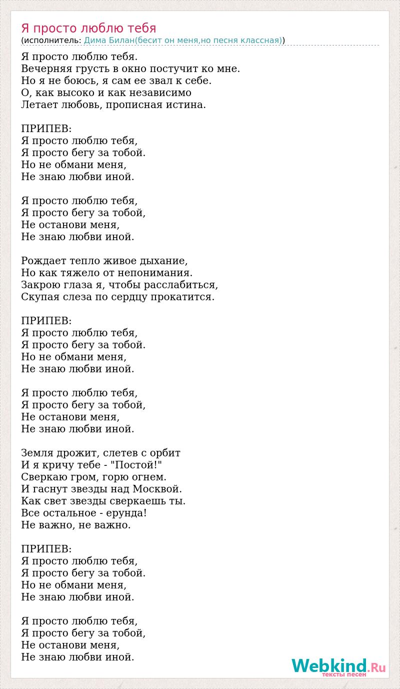 Я просто люблю тебя. Вечерняя грусть в окно постучит ко мне. Но я не боюсь, я сам ее звал к себе. О, как высоко и как независимо Летает любовь, прописная истина. ПРИПЕВ: Я просто люблю тебя, Я просто бегу за тобой. Но не обмани меня, Не знаю любви иной. Я просто люблю тебя, Я просто бегу за тобой, Не останови меня, Не знаю любви иной. Рождает тепло живое дыхание, Но как тяжело от непонимания. Закрою глаза я, чтобы расслабиться, Скупая слеза по сердцу прокатится. ПРИПЕВ: Я просто люблю тебя, Я просто бегу за тобой. Но не обмани меня, Не знаю любви иной. Я просто люблю тебя, Я просто бегу за тобой, Не останови меня, Не знаю любви иной. Земля дрожит, слетев с орбит И я кричу тебе - "Постой!" Сверкаю гром, горю огнем. И гаснут звезды над Москвой. Как свет звезды сверкаешь ты. Все остальное - ерунда! Не важно, не важно. ПРИПЕВ: Я просто люблю тебя, Я просто бегу за тобой. Но не обмани меня, Не знаю любви иной. Я просто люблю тебя, Я просто бегу за тобой, Не останови меня, Не знаю любви иной.
