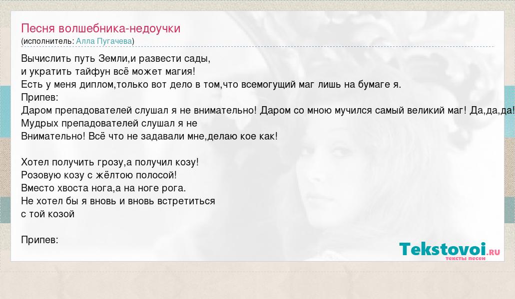 Вычислить путь Земли,и развести сады, и укратить тайфун всё может магия! Есть у меня диплом,только вот дело в том,что всемогущий маг лишь на бумаге я. Припев: Даром препадователей слушал я не внимательно! Даром со мною мучился самый великий маг! Да,да,да! Мудрых препадователей слушал я не Внимательно! Всё что не задавали мне,делаю кое как! Хотел получить грозу,а получил козу! Розовую козу с жёлтою полосой! Вместо хвоста нога,а на ноге рога. Не хотел бы я вновь и вновь встретиться с той козой Припев: