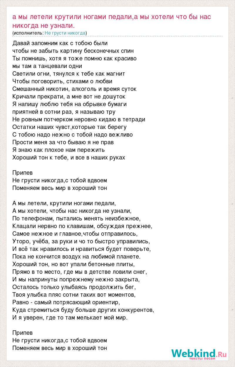 Главная→Исполнители→Не грусти никогда→А мы летели крутили ногами педали,а мы хотели что бы нас никогда не узнали.