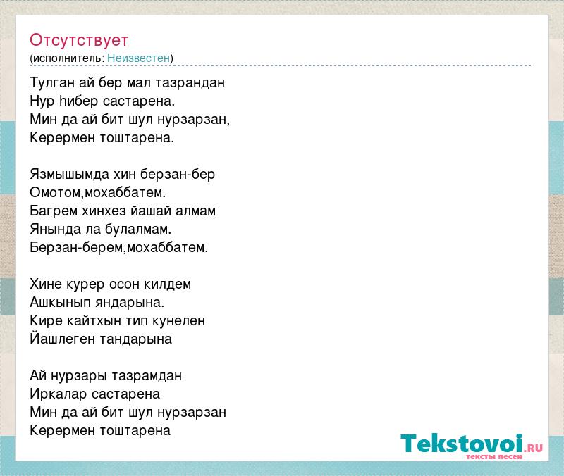 Тулган ай бер мал тазрандан Нур hибер састарена. Мин да ай бит шул нурзарзан, Керермен тоштарена. Язмышымда хин берзан-бер Омотом,мохаббатем. Багрем хинхез йашай алмам Янында ла булалмам. Берзан-берем,мохаббатем. Хине курер осон килдем Ашкынып яндарына. Кире кайтхын тип кунелен Йашлеген тандарына Ай нурзары тазрамдан Иркалар састарена Мин да ай бит шул нурзарзан Керермен тоштарена