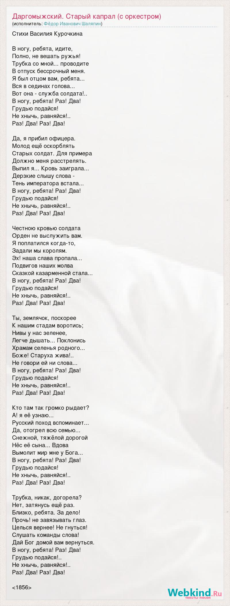 Стихи Василия Курочкина В ногу, ребята, идите, Полно, не вешать ружья! Трубка со мной... проводите В отпуск бессрочный меня. Я был отцом вам, ребята... Вся в сединах голова... Вот она - служба солдата!.. В ногу, ребята! Раз! Два! Грудью подайся! Не хнычь, равняйся!.. Раз! Два! Раз! Два! Да, я прибил офицера. Молод ещё оскорблять Старых солдат. Для примера Должно меня расстрелять. Выпил я... Кровь заиграла... Дерзкие слышу слова - Тень императора встала... В ногу, ребята! Раз! Два! Грудью подайся! Не хнычь, равняйся!.. Раз! Два! Раз! Два! Честною кровью солдата Орден не выслужить вам. Я поплатился когда-то, Задали мы королям. Эх! наша слава пропала... Подвигов наших молва Сказкой казарменной стала... В ногу, ребята! Раз! Два! Грудью подайся! Не хнычь, равняйся!.. Раз! Два! Раз! Два! Ты, землячок, поскорее К нашим стадам воротись; Нивы у нас зеленее, Легче дышать... Поклонись Храмам селенья родного... Боже! Старуха жива!.. Не говори ей ни слова... В ногу, ребята! Раз! Два! Грудью подайся! Не хнычь, равняйся!.. Раз! Два! Раз! Два! Кто там так громко рыдает? А! я её узнаю... Русский поход вспоминает... Да, отогрел всю семью... Снежной, тяжёлой дорогой Нёс её сына... Вдова Вымолит мир мне у Бога... В ногу, ребята! Раз! Два! Грудью подайся! Не хнычь, равняйся!.. Раз! Два! Раз! Два! Трубка, никак, догорела? Нет, затянусь ещё раз. Близко, ребята. За дело! Прочь! не завязывать глаз. Целься вернее! Не гнуться! Слушать команды слова! Дай Бог домой вам вернуться. В ногу, ребята! Раз! Два! Грудью подайся!.. Не хнычь, равняйся!.. Раз! Два! Раз! Два! <1856>