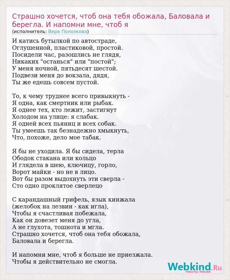 Главная→Исполнители→Вера Полозкова→Страшно хочется, чтоб она тебя обожала, Баловала и берегла. И напомни м
