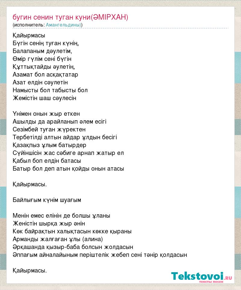Қайырмасы Бүгін сенің туған күнің, Балапаным дәулетім, Өмір гүлім сені бүгін Құттықтайды әулетің, Азамат бол асқақтатар Азат елдін сәулетін Намысты бол табысты бол Жемістін шаш сәулесін Үнімен онын жыр еткен Ашылды да арайланып әлем есігі Сезімбей туған жүректен Тербетілді алтын айдар ұлдын бесігі Қазақпыз ұлым батырдер Сүйіншісін жас сәбиге арнап жатыр ел Қабыл боп елдін батасы Батыр бол деп атын қойды онын атасы Қайырмасы. Байлығым күнім шуағым Менін емес елінін де болшы ұланы Женістін шырқа жыр әнін Көк байрақтын халықтасын көкке қыраны Арманды жалғаған ұлы (алина) Әрқашанда қызыр-баба болсын жолдасын Әппағым айналайыным періштелік жебеп сені тәнір қолдасын Қайырмасы.