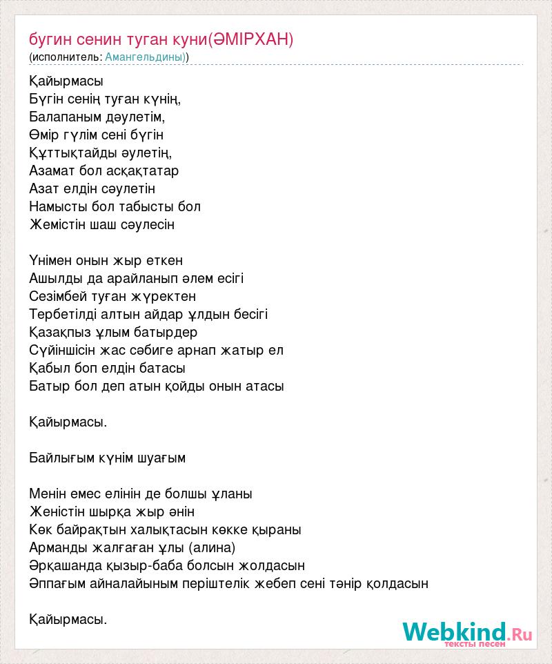 Қайырмасы Бүгін сенің туған күнің, Балапаным дәулетім, Өмір гүлім сені бүгін Құттықтайды әулетің, Азамат бол асқақтатар Азат елдін сәулетін Намысты бол табысты бол Жемістін шаш сәулесін Үнімен онын жыр еткен Ашылды да арайланып әлем есігі Сезімбей туған жүректен Тербетілді алтын айдар ұлдын бесігі Қазақпыз ұлым батырдер Сүйіншісін жас сәбиге арнап жатыр ел Қабыл боп елдін батасы Батыр бол деп атын қойды онын атасы Қайырмасы. Байлығым күнім шуағым Менін емес елінін де болшы ұланы Женістін шырқа жыр әнін Көк байрақтын халықтасын көкке қыраны Арманды жалғаған ұлы (алина) Әрқашанда қызыр-баба болсын жолдасын Әппағым айналайыным періштелік жебеп сені тәнір қолдасын Қайырмасы.