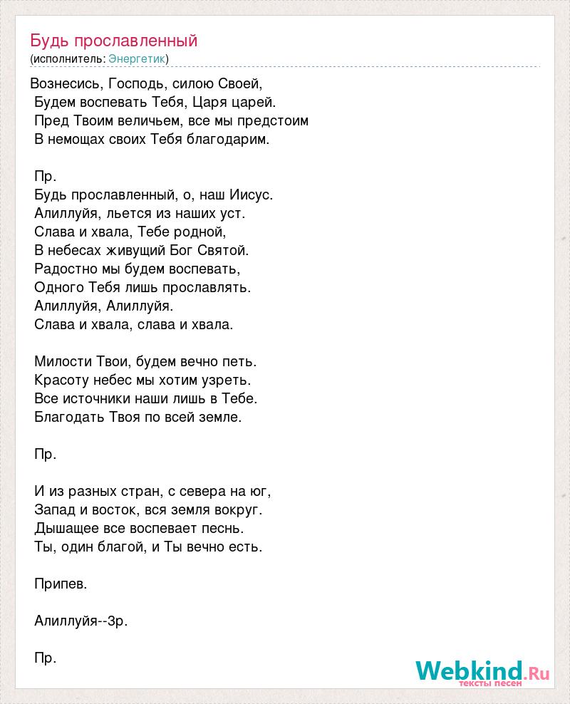 Вознесись, Господь, силою Своей, Будем воспевать Тебя, Царя царей. Пред Твоим величьем, все мы предстоим В немощах своих Тебя благодарим. Пр. Будь прославленный, о, наш Иисус. Алиллуйя, льется из наших уст. Слава и хвала, Тебе родной, В небесах живущий Бог Святой. Радостно мы будем воспевать, Одного Тебя лишь прославлять. Алиллуйя, Алиллуйя. Слава и хвала, слава и хвала. Милости Твои, будем вечно петь. Красоту небес мы хотим узреть. Все источники наши лишь в Тебе. Благодать Твоя по всей земле. Пр. И из разных стран, с севера на юг, Запад и восток, вся земля вокруг. Дышащее все воспевает песнь. Ты, один благой, и Ты вечно есть. Припев. Алиллуйя--3р. Пр.