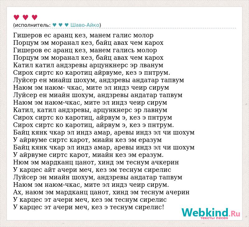 Гишеров ес аранц кез, манем галис молор Порцум эм моранал кез, байц авах чем карох Гишеров ес аранц кез, манем гались молор Порцум эм моранал кез, байц авах чем карох Катил катил андзревы арцункнерс эр лванум Сирох сиртс ко каротиц айрвуме, кез э пнтрум. Луйсер ен миайш шохум, андзревы андатар тапвум Наюм эм наюм- чкас, мите эл индз чеир сирум Луйсер ен миайн шохум, андзревы андатар тапвум Наюм эм наюм-чкас, мите эл индз чеир сирум Катил, катил андзревы, арцункнерс эр лавнум Сирох сиртс ко каротиц, айрвум э, кез э пнтрум Сирох сиртс ко каротиц, айрвум э, кез э пнтрум. Байц кянк чкар эл индз амар, аревы индз эл чи шохум У айрвуме сиртс карот, миайн кез эм еразум Байц кянк чкар эл индз амар, аревы индз эл чи шохум У айрвуме сиртс карот, миайн кез эм еразум. Нюм эм мардканц цанот, хинд эм теснум ачкерин У карцес айт ачери меч, кез эм теснум сирелис Луйсер эн миайн шохум, андзревы андатар тапвум Наюм эм наюм-чкас, мите эл индз чеир сирум. Ах, наюм эм мардканц цанот, хинд эм теснум ачерин У карцес эт ачери меч, кез эм теснум сирелис У карцес эт ачери меч, кез э теснум сирелис!