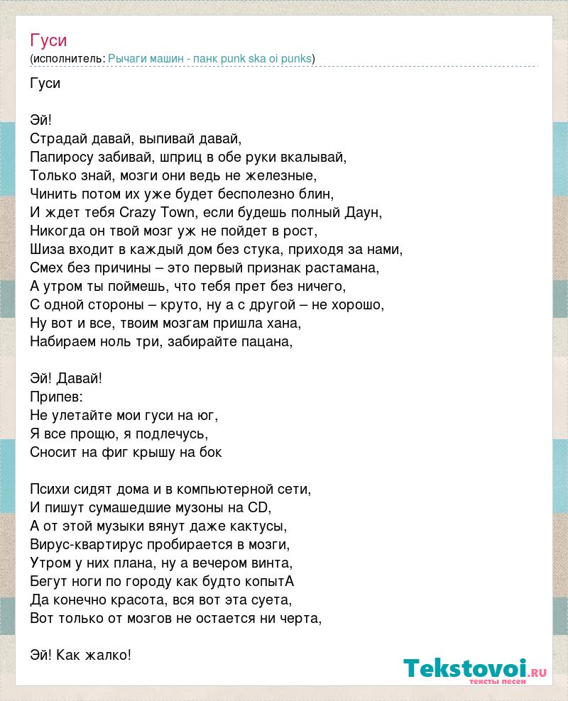 Гуси Эй! Страдай давай, выпивай давай, Папиросу забивай, шприц в обе руки вкалывай, Только знай, мозги они ведь не железные, Чинить потом их уже будет бесполезно блин, И ждет тебя Crazy Town, если будешь полный Даун, Никогда он твой мозг уж не пойдет в рост, Шиза входит в каждый дом без стука, приходя за нами, Смех без причины – это первый признак растамана, А утром ты поймешь, что тебя прет без ничего, С одной стороны – круто, ну а с другой – не хорошо, Ну вот и все, твоим мозгам пришла хана, Набираем ноль три, забирайте пацана, Эй! Давай! Припев: Не улетайте мои гуси на юг, Я все прощю, я подлечусь, Сносит на фиг крышу на бок Психи сидят дома и в компьютерной сети, И пишут сумашедшие музоны на CD, А от этой музыки вянут даже кактусы, Вирус-квартирус пробирается в мозги, Утром у них плана, ну а вечером винта, Бегут ноги по городу как будто копытА Да конечно красота, вся вот эта суета, Вот только от мозгов не остается ни черта, Эй! Как жалко!