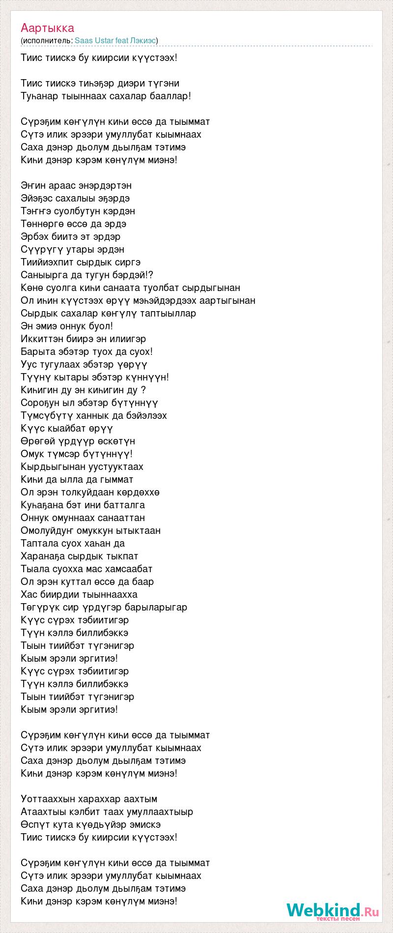 Тиис тиискэ бу киирсии күүстээх! Тиис тиискэ тиһэҕэр диэри түгэни Туһанар тыыннаах сахалар бааллар! Сүрэҕим көҥүлүн киһи өссө да тыыммат Сүтэ илик эрээри умуллубат кыымнаах Саха дэнэр дьолум дьылҕам тэтимэ Киһи дэнэр кэрэм көнүлүм миэнэ! Эҥин араас энэрдэртэн Эйэҕэс сахалыы эҕэрдэ Тэҥҥэ суолбутун кэрдэн Төннөргө өссө да эрдэ Эрбэх биитэ эт эрдэр Сүүрүгү утары эрдэн Тиийиэхпит сырдык сиргэ Саныырга да тугун бэрдэй!? Көнө суолга киһи санаата туолбат сырдыгынан Ол иһин күүстээх өрүү мэһэйдэрдээх аартыгынан Сырдык сахалар көҥүлү таптыыллар Эн эмиэ оннук буол! Иккиттэн биирэ эн илиигэр Барыта эбэтэр туох да суох! Уус тугулаах эбэтэр үөрүү Түүнү кытары эбэтэр күннүүн! Киһигин ду эн киһигин ду ? Сороҕун ыл эбэтэр бүтүннүү Түмсүбүтү ханнык да бэйэлээх Күүс кыайбат өрүү Өрөгөй үрдүүр өскөтүн Омук түмсэр бүтүннүү! Кырдьыгынан уустууктаах Киһи да ылла да гыммат Ол эрэн толкуйдаан көрдөххө Куһаҕана бэт ини батталга Оннук омуннаах санааттан Омолуйдуҥ омуккун ытыктаан Таптала суох хаһан да Харанаҕа сырдык тыкпат Тыала суохха мас хамсаабат Ол эрэн куттал өссө да баар Хас биирдии тыыннаахха Төгүрүк сир үрдүгэр барыларыгар Күүс сүрэх тэбиитигэр Түүн кэллэ биллибэккэ Тыын тиийбэт түгэнигэр Кыым эрэли эргитиэ! Күүс сүрэх тэбиитигэр Түүн кэллэ биллибэккэ Тыын тиийбэт түгэнигэр Кыым эрэли эргитиэ! Сүрэҕим көҥүлүн киһи өссө да тыыммат Сүтэ илик эрээри умуллубат кыымнаах Саха дэнэр дьолум дьылҕам тэтимэ Киһи дэнэр кэрэм көнүлүм миэнэ! Уоттааххын хараххар аахтым Атаахтыы кэлбит таах умуллаахтыыр Өспүт кута күөдьүйэр эмискэ Тиис тиискэ бу киирсии күүстээх! Сүрэҕим көҥүлүн киһи өссө да тыыммат Сүтэ илик эрээри умуллубат кыымнаах Саха дэнэр дьолум дьылҕам тэтимэ Киһи дэнэр кэрэм көнүлүм миэнэ!