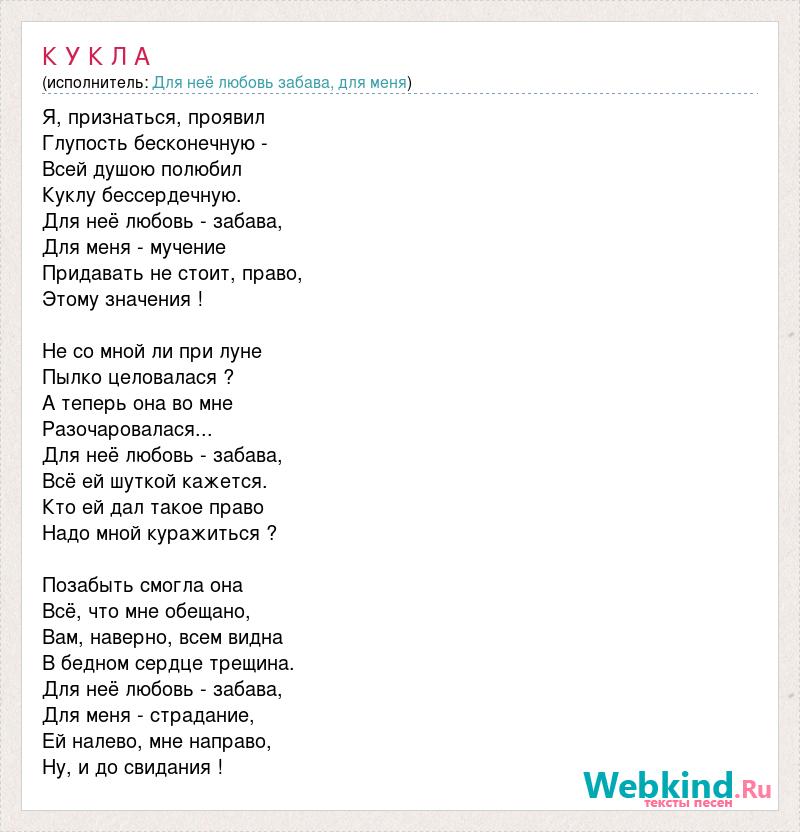 Я, признаться, проявил Глупость бесконечную - Всей душою полюбил Куклу бессердечную. Для неё любовь - забава, Для меня - мучение Придавать не стоит, право, Этому значения ! Не со мной ли при луне Пылко целовалася ? А теперь она во мне Разочаровалася... Для неё любовь - забава, Всё ей шуткой кажется. Кто ей дал такое право Надо мной куражиться ? Позабыть смогла она Всё, что мне обещано, Вам, наверно, всем видна В бедном сердце трещина. Для неё любовь - забава, Для меня - страдание, Ей налево, мне направо, Ну, и до свидания !