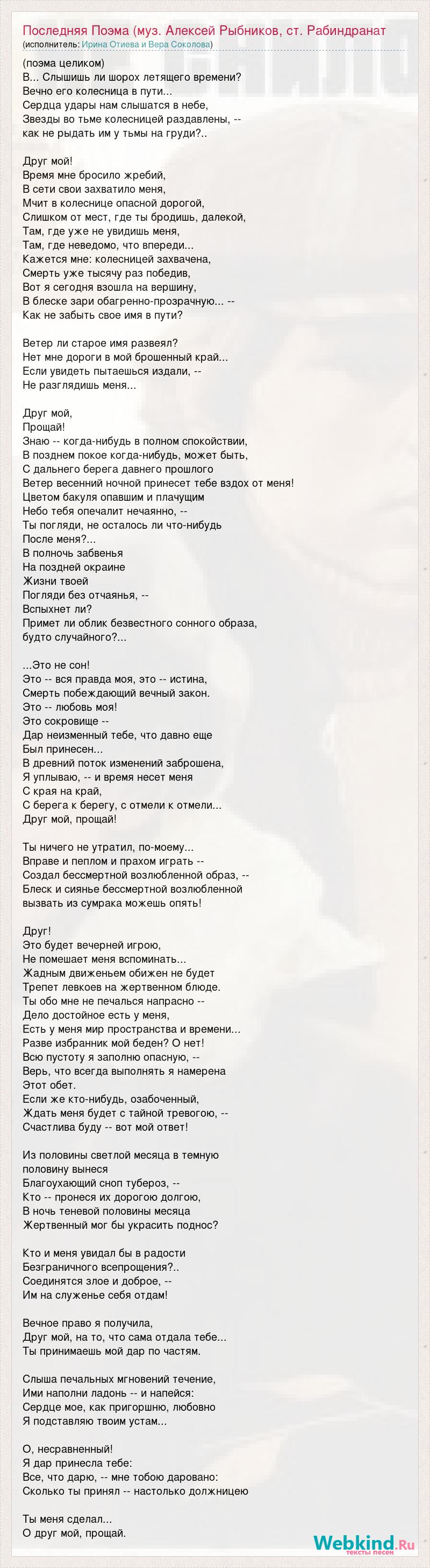 Главная→Исполнители→Ирина Отиева и Вера Соколова→Последняя Поэма (муз. Алексей Рыбников, ст. Рабиндранат