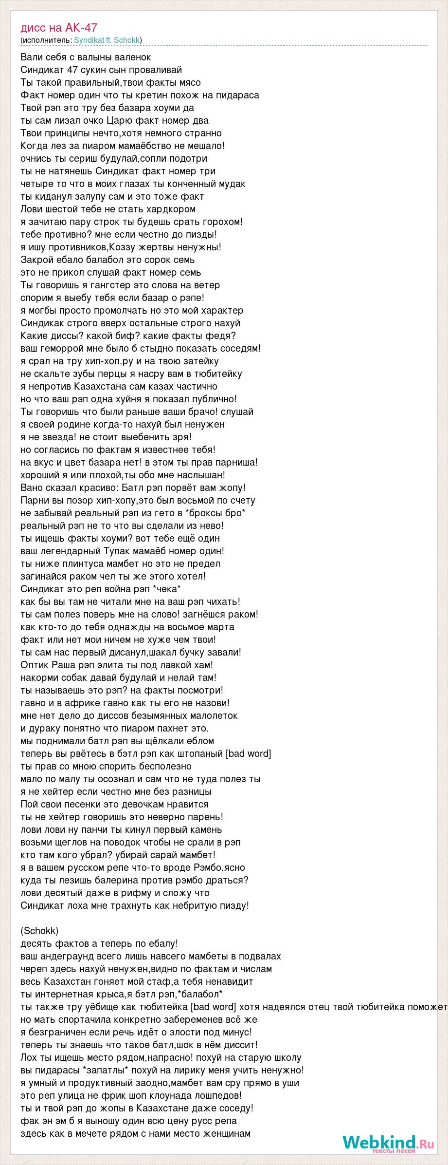 Вали себя с валыны валенок Синдикат 47 сукин сын проваливай Ты такой правильный,твои факты мясо Факт номер один что ты кретин похож на пидараса Твой рэп это тру без базара хоуми да ты сам лизал очко Царю факт номер два Твои принципы нечто,хотя немного странно Когда лез за пиаром мамаёбство не мешало! очнись ты сериш будулай,сопли подотри ты не натянешь Синдикат факт номер три четыре то что в моих глазах ты конченный мудак ты киданул залупу сам и это тоже факт Лови шестой тебе не стать хардкором я зачитаю пару строк ты будешь срать горохом! тебе противно? мне если честно до пизды! я ишу противников,Коззу жертвы ненужны! Закрой ебало балабол это сорок семь это не прикол слушай факт номер семь Ты говоришь я гангстер это слова на ветер спорим я выебу тебя если базар о рэпе! я могбы просто промолчать но это мой характер Синдикак строго вверх остальные строго нахуй Какие диссы? какой биф? какие факты федя? ваш геморрой мне было б стыдно показать соседям! я срал на тру хип-хоп.ру и на твою затейку не скальте зубы перцы я насру вам в тюбитейку я непротив Казахстана сам казах частично но что ваш рэп одна хуйня я показал публично! Ты говоришь что были раньше ваши брачо! слушай я своей родине когда-то нахуй был ненужен я не звезда! не стоит выебенить зря! но согласись по фактам я известнее тебя! на вкус и цвет базара нет! в этом ты прав парниша! хороший я или плохой,ты обо мне наслышан! Вано сказал красиво: Батл рэп порвёт вам жопу! Парни вы позор хип-хопу,это был восьмой по счету не забывай реальный рэп из гето в *броксы бро* реальный рэп не то что вы сделали из нево! ты ищешь факты хоуми? вот тебе ещё один ваш легендарный Тупак мамаёб номер один! ты ниже плинтуса мамбет но это не предел загинайся раком чел ты же этого хотел! Синдикат это реп война рэп *чека* как бы вы там не читали мне на ваш рэп чихать! ты сам полез поверь мне на слово! загнёшся раком! как кто-то до тебя однажды на восьмое марта факт или нет мои ничем не хуже чем твои! ты сам нас первый дисанул,шакал бучку завали! Оптик Раша рэп элита ты под лавкой хам! накорми собак давай будулай и нелай там! ты называешь это рэп? на факты посмотри! гавно и в африке гавно как ты его не назови! мне нет дело до диссов безымянных малолеток и дураку понятно что пиаром пахнет это. мы поднимали батл рэп вы щёлкали еблом теперь вы рвётесь в бэтл рэп как штопаный [bad word] ты прав со мною спорить бесполезно мало по малу ты осознал и сам что не туда полез ты я не хейтер если честно мне без разницы Пой свои песенки это девочкам нравится ты не хейтер говоришь это неверно парень! лови лови ну панчи ты кинул первый камень возьми щеглов на поводок чтобы не срали в рэп кто там кого убрал? убирай сарай мамбет! я в вашем русском репе что-то вроде Рэмбо,ясно куда ты лезишь балерина против рэмбо драться? лови десятый даже в рифму и сложу что Синдикат лоха мне трахнуть как небритую пизду! (Schokk) десять фактов а теперь по ебалу! ваш андеграунд всего лишь навсего мамбеты в подвалах череп здесь нахуй ненужен,видно по фактам и числам весь Казахстан гоняет мой стаф,а тебя ненавидит ты интернетная крыса,я бэтл рэп,*балабол* ты также тру уёбище как тюбитейка [bad word] хотя надеялся отец твой тюбитейка поможет но мать спортачила конкретно забеременев всё же я безграничен если речь идёт о злости под минус! теперь ты знаешь что такое батл,шок в нём диссит! Лох ты и