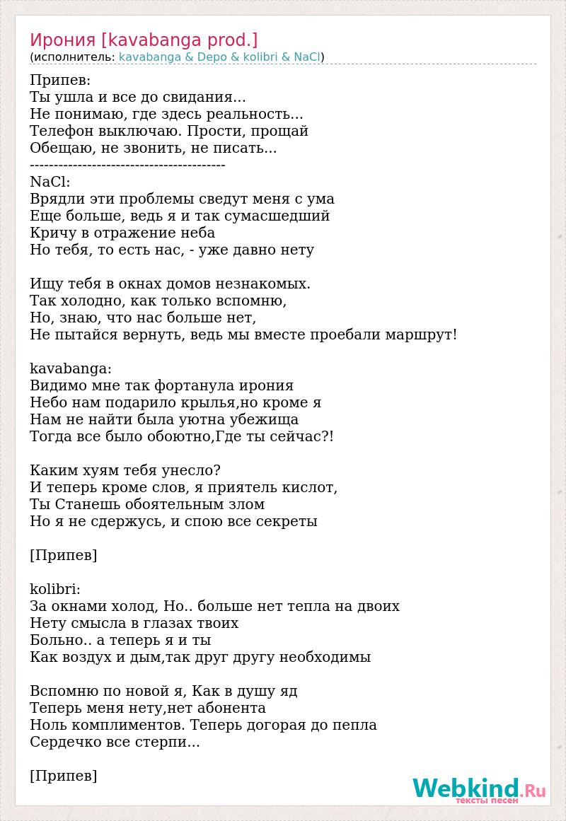Припев: Ты ушла и все до свидания... Не понимаю, где здесь реальность... Телефон выключаю. Прости, прощай Обещаю, не звонить, не писать... ----------------------------------------- NaCl: Врядли эти проблемы сведут меня с ума Еще больше, ведь я и так сумасшедший Кричу в отражение неба Но тебя, то есть нас, - уже давно нету Ищу тебя в окнах домов незнакомых. Так холодно, как только вспомню, Но, знаю, что нас больше нет, Не пытайся вернуть, ведь мы вместе проебали маршрут! kavabanga: Видимо мне так фортанула ирония Небо нам подарило крылья,но кроме я Нам не найти была уютна убежища Тогда все было обоютно,Где ты сейчас?! Каким хуям тебя унесло? И теперь кроме слов, я приятель кислот, Ты Станешь обоятельным злом Но я не сдержусь, и спою все секреты [Припев] kolibri: За окнами холод, Но.. больше нет тепла на двоих Нету смысла в глазах твоих Больно.. а теперь я и ты Как воздух и дым,так друг другу необходимы Вспомню по новой я, Как в душу яд Теперь меня нету,нет абонента Ноль комплиментов. Теперь догорая до пепла Сердечко все стерпи... [Припев]