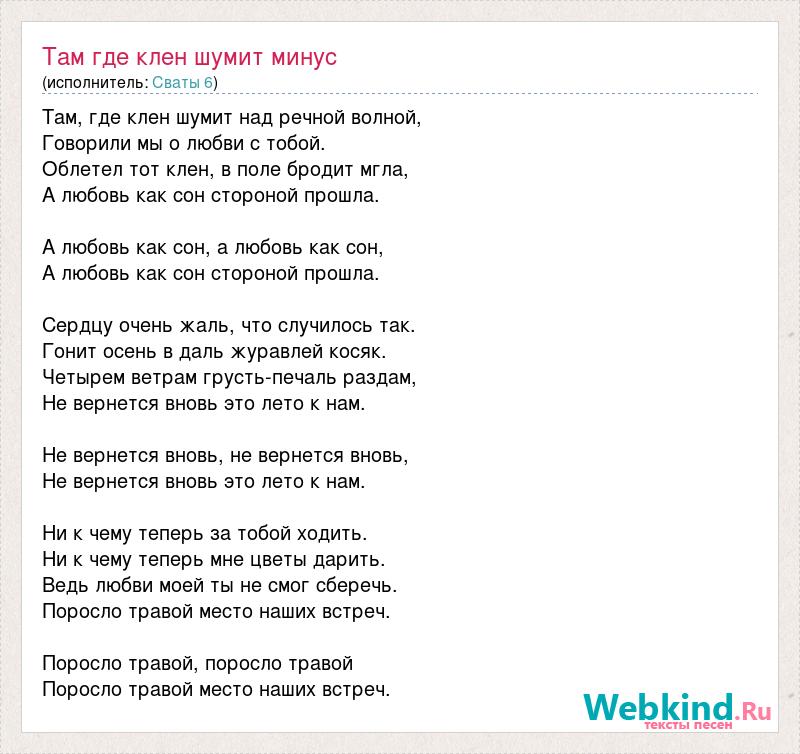 Там, где клен шумит над речной волной, Говорили мы о любви с тобой. Облетел тот клен, в поле бродит мгла, А любовь как сон стороной прошла. А любовь как сон, а любовь как сон, А любовь как сон стороной прошла. Сердцу очень жаль, что случилось так. Гонит осень в даль журавлей косяк. Четырем ветрам грусть-печаль раздам, Hе вернется вновь это лето к нам. Hе вернется вновь, не вернется вновь, Hе вернется вновь это лето к нам. Hи к чему теперь за тобой ходить. Hи к чему теперь мне цветы дарить. Ведь любви моей ты не смог сберечь. Поросло травой место наших встреч. Поросло травой, поросло травой Поросло травой место наших встреч.