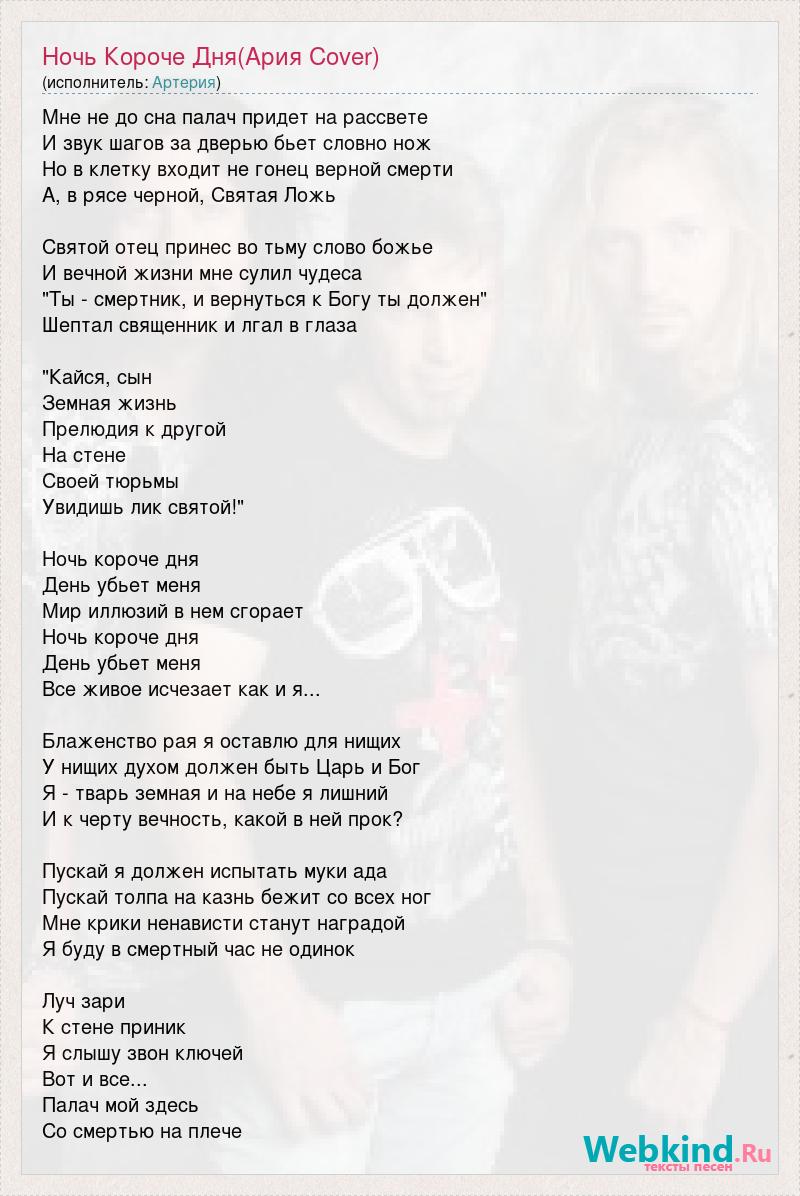 Мне не до сна палач придет на рассвете И звук шагов за дверью бьет словно нож Но в клетку входит не гонец верной смерти А, в рясе черной, Святая Ложь Святой отец принес во тьму слово божье И вечной жизни мне сулил чудеса "Ты - смертник, и вернуться к Богу ты должен" Шептал священник и лгал в глаза "Кайся, сын Земная жизнь Прелюдия к другой На стене Своей тюрьмы Увидишь лик святой!" Ночь короче дня День убьет меня Мир иллюзий в нем сгорает Ночь короче дня День убьет меня Все живое исчезает как и я... Блаженство рая я оставлю для нищих У нищих духом должен быть Царь и Бог Я - тварь земная и на небе я лишний И к черту вечность, какой в ней прок? Пускай я должен испытать муки ада Пускай толпа на казнь бежит со всех ног Мне крики ненависти станут наградой Я буду в смертный час не одинок Луч зари К стене приник Я слышу звон ключей Вот и все... Палач мой здесь Со смертью на плече