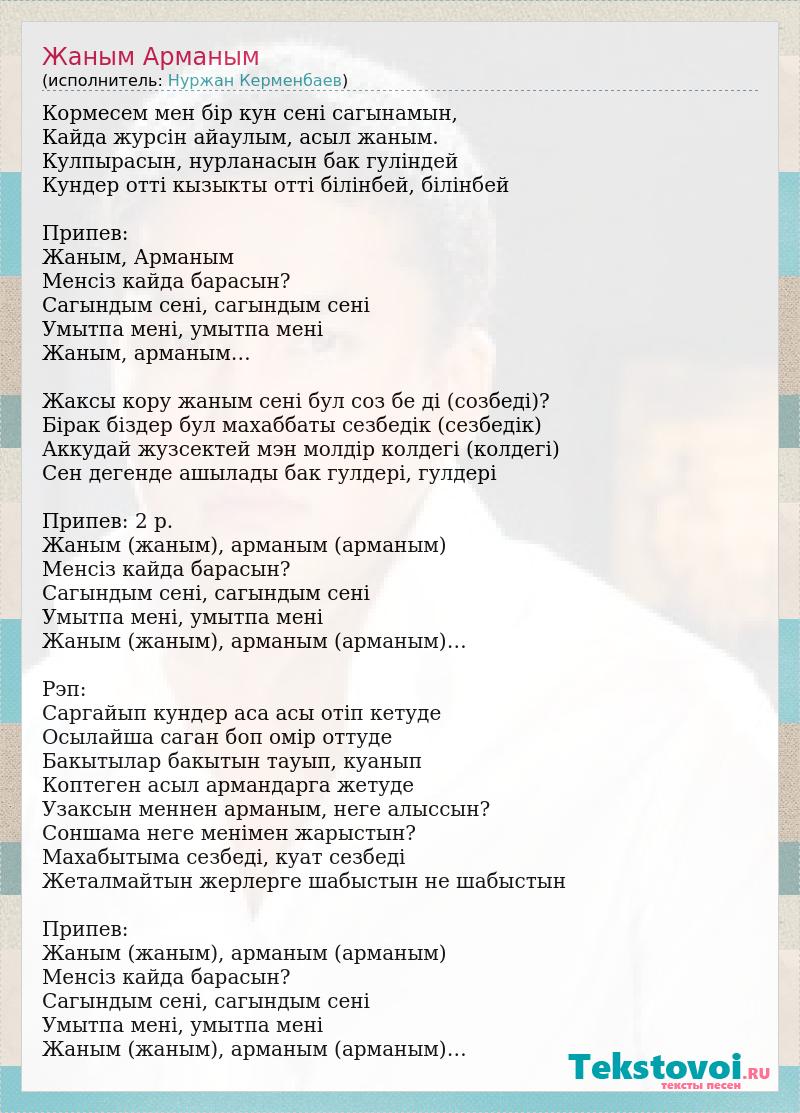 Кормесем мен бiр кун сенi сагынамын, Кайда журсiн айаулым, асыл жаным. Кулпырасын, нурланасын бак гулiндей Кундер оттi кызыкты оттi бiлiнбей, бiлiнбей Припев: Жаным, Арманым Менсiз кайда барасын? Сагындым сенi, сагындым сенi Умытпа менi, умытпа менi Жаным, арманым… Жаксы кору жаным сенi бул соз бе дi (созбедi)? Бiрак бiздер бул махаббаты сезбедiк (сезбедiк) Аккудай жузсектей мэн молдiр колдегi (колдегi) Cен дегенде ашылады бак гулдерi, гулдерi Припев: 2 р. Жаным (жаным), арманым (арманым) Менсiз кайда барасын? Сагындым сенi, сагындым сенi Умытпа менi, умытпа менi Жаным (жаным), арманым (арманым)… Рэп: Саргайып кундер аса асы отiп кетуде Осылайша саган боп омiр оттуде Бакытылар бакытын тауып, куанып Коптеген асыл армандарга жетуде Узаксын меннен арманым, неге алыссын? Соншама неге менiмен жарыстын? Махабытыма сезбедi, куат сезбедi Жеталмайтын жерлерге шабыстын не шабыстын Припев: Жаным (жаным), арманым (арманым) Менсiз кайда барасын? Сагындым сенi, сагындым сенi Умытпа менi, умытпа менi Жаным (жаным), арманым (арманым)…