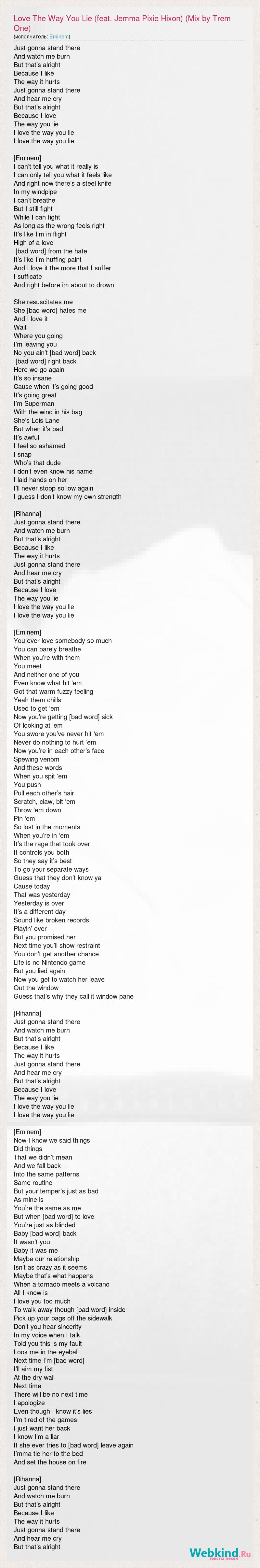 Just gonna stand there And watch me burn But that’s alright Because I like The way it hurts Just gonna stand there And hear me cry But that’s alright Because I love The way you lie I love the way you lie I love the way you lie [Eminem] I can’t tell you what it really is I can only tell you what it feels like And right now there’s a steel knife In my windpipe I can’t breathe But I still fight While I can fight As long as the wrong feels right It’s like I’m in flight High of a love [bad word] from the hate It’s like I’m huffing paint And I love it the more that I suffer I sufficate And right before im about to drown She resuscitates me She [bad word] hates me And I love it Wait Where you going I’m leaving you No you ain’t [bad word] back [bad word] right back Here we go again It’s so insane Cause when it’s going good It’s going great I’m Superman With the wind in his bag She’s Lois Lane But when it’s bad It’s awful I feel so ashamed I snap Who’s that dude I don’t even know his name I laid hands on her I’ll never stoop so low again I guess I don’t know my own strength [Rihanna] Just gonna stand there And watch me burn But that’s alright Because I like The way it hurts Just gonna stand there And hear me cry But that’s alright Because I love The way you lie I love the way you lie I love the way you lie [Eminem] You ever love somebody so much You can barely breathe When you’re with them You meet And neither one of you Even know what hit ‘em Got that warm fuzzy feeling Yeah them chills Used to get ‘em Now you’re getting [bad word] sick Of looking at ‘em You swore you’ve never hit ‘em Never do nothing to hurt ‘em Now you’re in each other’s face Spewing venom And these words When you spit ‘em You push Pull each other’s hair Scratch, claw, bit ‘em Throw ‘em down Pin ‘em So lost in the moments When you’re in ‘em It’s the rage that took over It controls you both So they say it’s best To go your separate ways Guess that they don’t know ya Cause today That was yesterday Yesterday is over It’s a different day Sound like broken records Playin’ over But you promised her Next time you’ll show restraint You don’t get another chance Life is no Nintendo game But you lied again Now you get to watch her leave Out the window Guess that’s why they call it window pane [Rihanna] Just gonna stand there And watch me burn But that’s alright Because I like The way it hurts Just gonna stand there And hear me cry But that’s alright Because I love The way you lie I love the way you lie I love the way you lie [Eminem] Now I know we said things Did things That we didn’t mean And we fall back Into the same patterns Same routine But your temper’s just as bad As mine is You’re the same as me But when [bad word] to love You’re just as blinded Baby [bad word] back It wasn’t you Baby it was me Maybe our relationship Isn’t as crazy as it seems Maybe that’s what happens When a tornado meets a volcano All I know is I love you too much To walk away though [bad word] inside Pick up your bags off the sidewalk Don’t you hear sincerity In my voice when I talk Told you this is my fault Look me in the eyeball Next time I’m [bad word] I’ll aim my fist At the dry wall Next time There will be no next time I apologize Even though I know it’s lies I’m tired of the games I just want her back I know I’m a liar If she ever tries to [bad word] leave again I’mma tie her to the bed And set the house on fire [Rihanna] Just gonna stand there And watch me burn But that’s alright Because I like The way it hurts Just gonna stand there And hear me cry But that’s alright