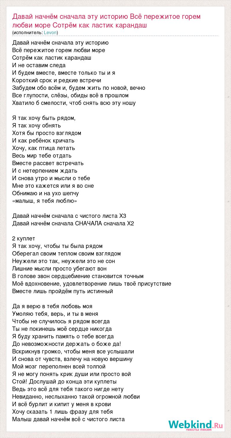 Давай начнём сначала эту историю Всё пережитое горем любви море Сотрём как ластик карандаш И не оставим следа И будем вместе, вместе только ты и я Короткий срок и редкие встречи Забудем обо всём и, будем жить по новой, вечно Все глупости, слёзы, обиды всё в прошлом Хватило б смелости, чтоб снять всю эту ношу Я так хочу быть рядом, Я так хочу обнять Хотя бы просто взглядом И как ребёнок кричать Хочу, как птица летать Весь мир тебе отдать Вместе рассвет встречать И с нетерпением ждать И снова утро и мысли о тебе Мне это кажется или я во сне Обнимаю и на ухо шепчу «малыш, я тебя люблю» Давай начнём сначала с чистого листа X3 Давай начнём сначала СНАЧАЛА сначала Х2 2 куплет Я так хочу, чтобы ты была рядом Оберегал своим теплом своим взглядом Неужели это так, неужели это не сон Лишние мысли просто убегают вон В голове звон сердцебиение становится точным Моё вдохновение, удовлетворение лишь твоё присутствие Вместе лишь пройдём путь истинный Да я верю в тебя любовь моя Умоляю тебя, верь, и ты в меня Чтобы не случилось я рядом всегда Ты не покинешь моё сердце никогда Я буду хранить память о тебе всегда До невозможности держать о боже да! Вскрикнув громко, чтобы меня все услышали И снова от чувств, взлечу на новую вершину Мой мозг переполнен всей толпой Я не могу понять крик души или просто вой Стой! Дослушай до конца эти куплеты Ведь это всё для тебя такого нигде нету Невиданно, неслыханно такой огромной любви И всё бурлит и кипит у меня в крови Хочу сказать 1 лишь фразу для тебя Малыш давай начнём всё с чистого листа
