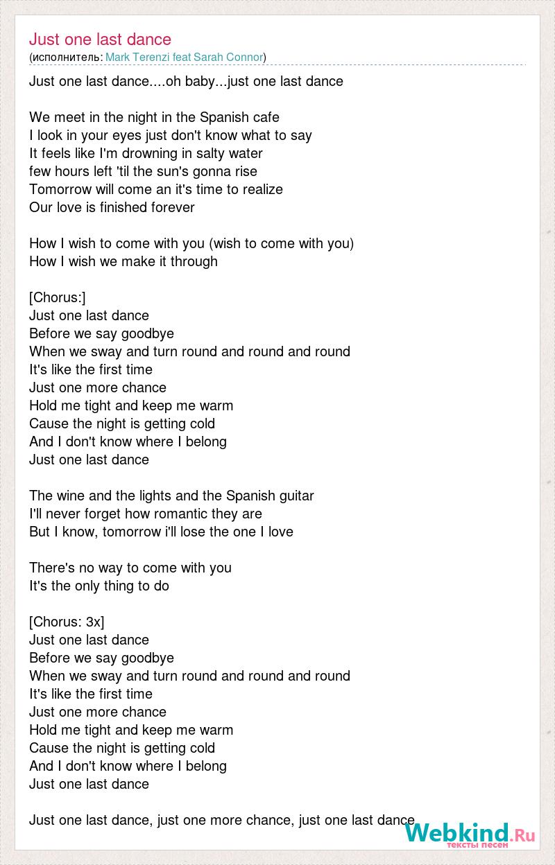 Just one last dance....oh baby...just one last dance We meet in the night in the Spanish cafе I look in your eyes just don't know what to say It feels like I'm drowning in salty water few hours left 'til the sun's gonna rise Tomorrow will come an it's time to realize Our love is finished forever How I wish to come with you (wish to come with you) How I wish we make it through [Chorus:] Just one last dance Before we say goodbye When we sway and turn round and round and round It's like the first time Just one more chance Hold me tight and keep me warm Cause the night is getting cold And I don't know where I belong Just one last dance The wine and the lights and the Spanish guitar I'll never forget how romantic they are But I know, tomorrow i'll lose the one I love There's no way to come with you It's the only thing to do [Chorus: 3x] Just one last dance Before we say goodbye When we sway and turn round and round and round It's like the first time Just one more chance Hold me tight and keep me warm Cause the night is getting cold And I don't know where I belong Just one last dance Just one last dance, just one more chance, just one last dance