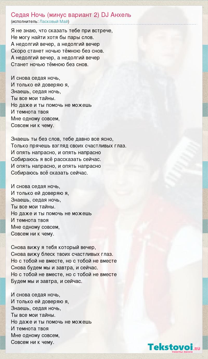 Я не знаю, что сказать тебе при встрече, Не могу найти хотя бы пары слов. А недолгий вечер, а недолгий вечер Скоро станет ночью тёмною без снов. А недолгий вечер, а недолгий вечер Станет ночью тёмною без снов. И снова седая ночь, И только ей доверяю я, Знаешь, седая ночь, Ты все мои тайны. Но даже и ты помочь не можешь И темнота твоя Мне одному совсем, Совсем ни к чему. Знаешь ты без слов, тебе давно все ясно, Только прячешь взгляд своих счастливых глаз. И опять напрасно, и опять напрасно Собираюсь я всё рассказать сейчас. И опять напрасно, и опять напрасно Собираюсь всё сказать сейчас. И снова седая ночь, И только ей доверяю я, Знаешь, седая ночь, Ты все мои тайны. Но даже и ты помочь не можешь И темнота твоя Мне одному совсем, Совсем ни к чему. Снова вижу я тебя который вечер, Снова вижу блеск твоих счастливых глаз. Но с тобой не вместе, но с тобой не вместе Снова будем мы и завтра, и сейчас. Но с тобой не вместе, но с тобой не вместе Будем мы и завтра, и сейчас. И снова седая ночь, И только ей доверяю я, Знаешь, седая ночь, Ты все мои тайны. Но даже и ты помочь не можешь И темнота твоя Мне одному совсем, Совсем ни к чему.