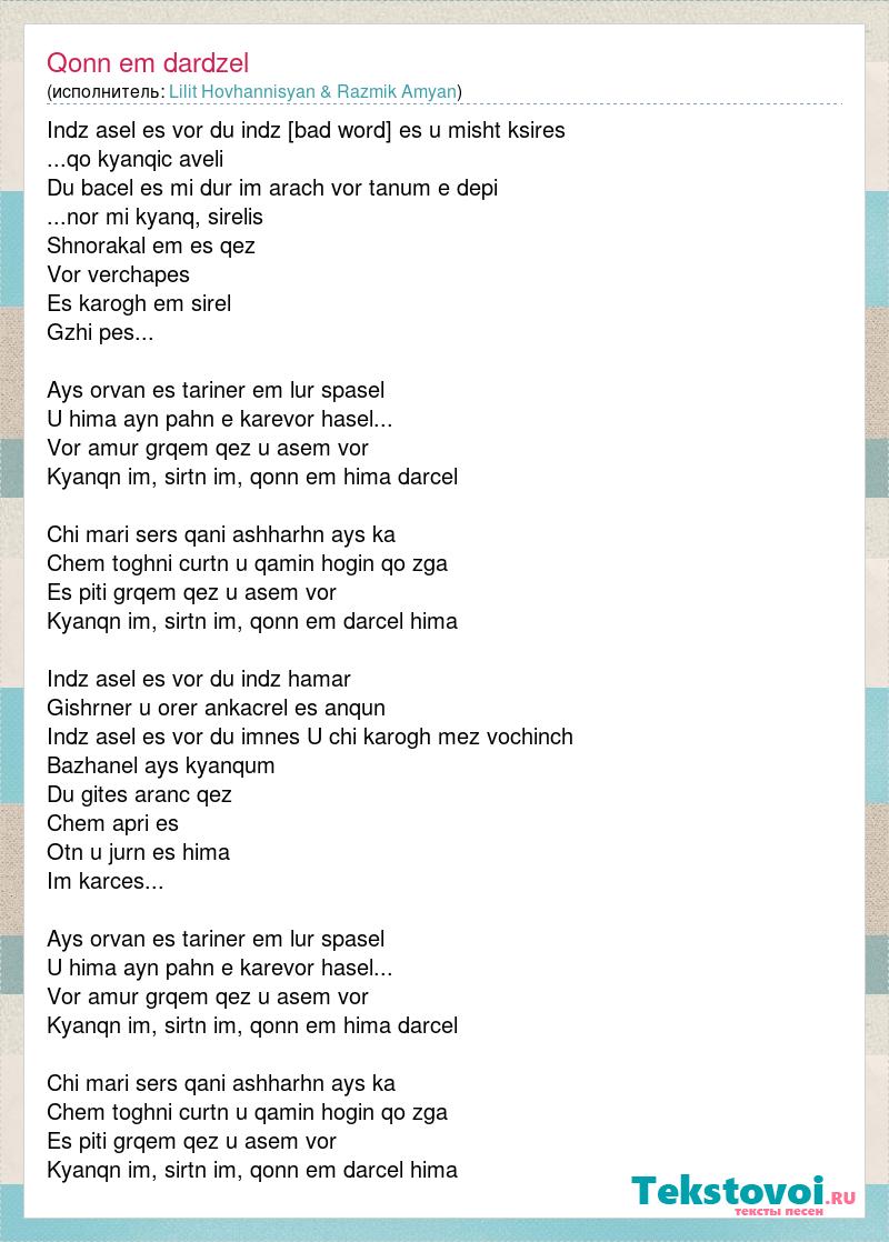 Indz asel es vor du indz sirum es u misht ksires ...qo kyanqic aveli Du bacel es mi dur im arach vor tanum e depi ...nor mi kyanq, sirelis Shnorakal em es qez Vor verchapes Es karogh em sirel Gzhi pes... Ays orvan es tariner em lur spasel U hima ayn pahn e karevor hasel... Vor amur grqem qez u asem vor Kyanqn im, sirtn im, qonn em hima darcel Chi mari sers qani ashharhn ays ka Chem toghni curtn u qamin hogin qo zga Es piti grqem qez u asem vor Kyanqn im, sirtn im, qonn em darcel hima Indz asel es vor du indz hamar Gishrner u orer ankacrel es anqun Indz asel es vor du imnes U chi karogh mez vochinch Bazhanel ays kyanqum Du gites aranc qez Chem apri es Otn u jurn es hima Im karces... Ays orvan es tariner em lur spasel U hima ayn pahn e karevor hasel... Vor amur grqem qez u asem vor Kyanqn im, sirtn im, qonn em hima darcel Chi mari sers qani ashharhn ays ka Chem toghni curtn u qamin hogin qo zga Es piti grqem qez u asem vor Kyanqn im, sirtn im, qonn em darcel hima