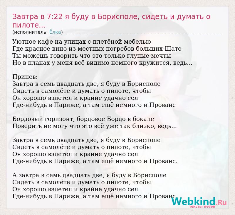 Уютное кафе на улицах с плетёной мебелью Где красное вино из местных погребов больших Шато Ты можешь говорить что это только глупые мечты Но в планах у меня всё видимо немного кружится, ведь... Припев: Завтра в семь двадцать две, я буду в Борисполе Сидеть в самолёте и думать о пилоте, чтобы Он хорошо взлетел и крайне удачно сел Где-нибудь в Париже, а там ещё немного и Прованс Бордовый горизонт, бордовое Бордо в бокале Поверить не могу что это всё уже так близко, ведь... Завтра в семь двадцать две, я буду в Борисполе Сидеть в самолёте и думать о пилоте, чтобы Он хорошо взлетел и крайне удачно сел Где-нибудь в Париже, а там ещё немного и Прованс. А завтра в семь двадцать две, я буду в Борисполе Сидеть в самолёте и думать о пилоте, чтобы Он хорошо взлетел и крайне удачно сел Где-нибудь в Париже, а там ещё немного и Прованс.