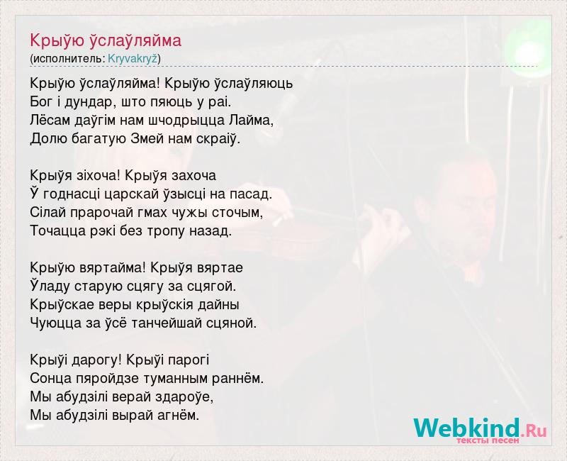 Крыўю ўслаўляйма! Крыўю ўслаўляюць Бог і дундар, што пяюць у раі. Лёсам даўгім нам шчодрыцца Лайма, Долю багатую Змей нам скраіў. Крыўя зіхоча! Крыўя захоча Ў годнасці царскай ўзысці на пасад. Сілай прарочай гмах чужы сточым, Точацца рэкі без тропу назад. Крыўю вяртайма! Крыўя вяртае Ўладу старую сцягу за сцягой. Крыўскае веры крыўскія дайны Чуюцца за ўсё танчейшай сцяной. Крыўі дарогу! Крыўі парогі Сонца пяройдзе туманным раннём. Мы абудзілі верай здароўе, Мы абудзілі вырай агнём.