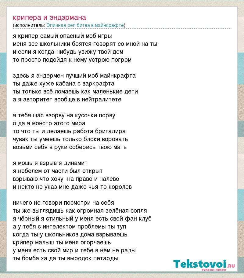 я крипер самый опасный моб игры меня все школьники боятся говорят со мной на ты и если я когда-нибудь увижу твой дом то просто подойдя к нему устрою погром здесь я эндермен лучший моб майнкрафта ты даже хуже кабана с варкрафта ты только всё ломаешь как маленькие дети а я авторитет вообще в нейтралитете я тебя щас взорву на кусочки порву о да я монстр этого мира то что ты и делаешь работа бригадира чувак ты умеешь только блоки воровать возьми себя в руки соберись твою мать я мощь я взрыв я динамит я нобелем от части был открыт взрываю что хочу на право и налево и некто не указ мне даже чья-то королев ничего не говори посмотри на себя ты же выглядишь как огромная зелёная сопля я чёрный я стильный у меня есть свой фан клуб а у тебя с интелектом проблемы ты туп когда ты у школьников дома взрываешь крипер малыш ты меня огорчаешь у меня есть свой мир и тебе в нём не рады ты бомба ха да ты выродок петарды