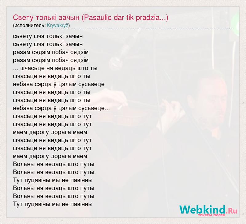 сьвету шчэ толькі зачын сьвету шчэ толькі зачын разам сядзім побач сядзім разам сядзім побач сядзім ... шчасьце ня ведаць што ты шчасьце ня ведаць што ты небава сэрца ў цэлым сусьвеце шчасьце ня ведаць што ты шчасьце ня ведаць што ты небава сэрца ў цэлым сусьвеце... шчасьце ня ведаць што тут шчасьце ня ведаць што тут маем дарогу дорага маем шчасьце ня ведаць што тут шчасьце ня ведаць што тут маем дарогу дорага маем Вольны ня ведаць што путы Вольны ня ведаць што путы Тут пуцявіны мы не павінны Вольны ня ведаць што путы Вольны ня ведаць што путы Тут пуцявіны мы не павінны