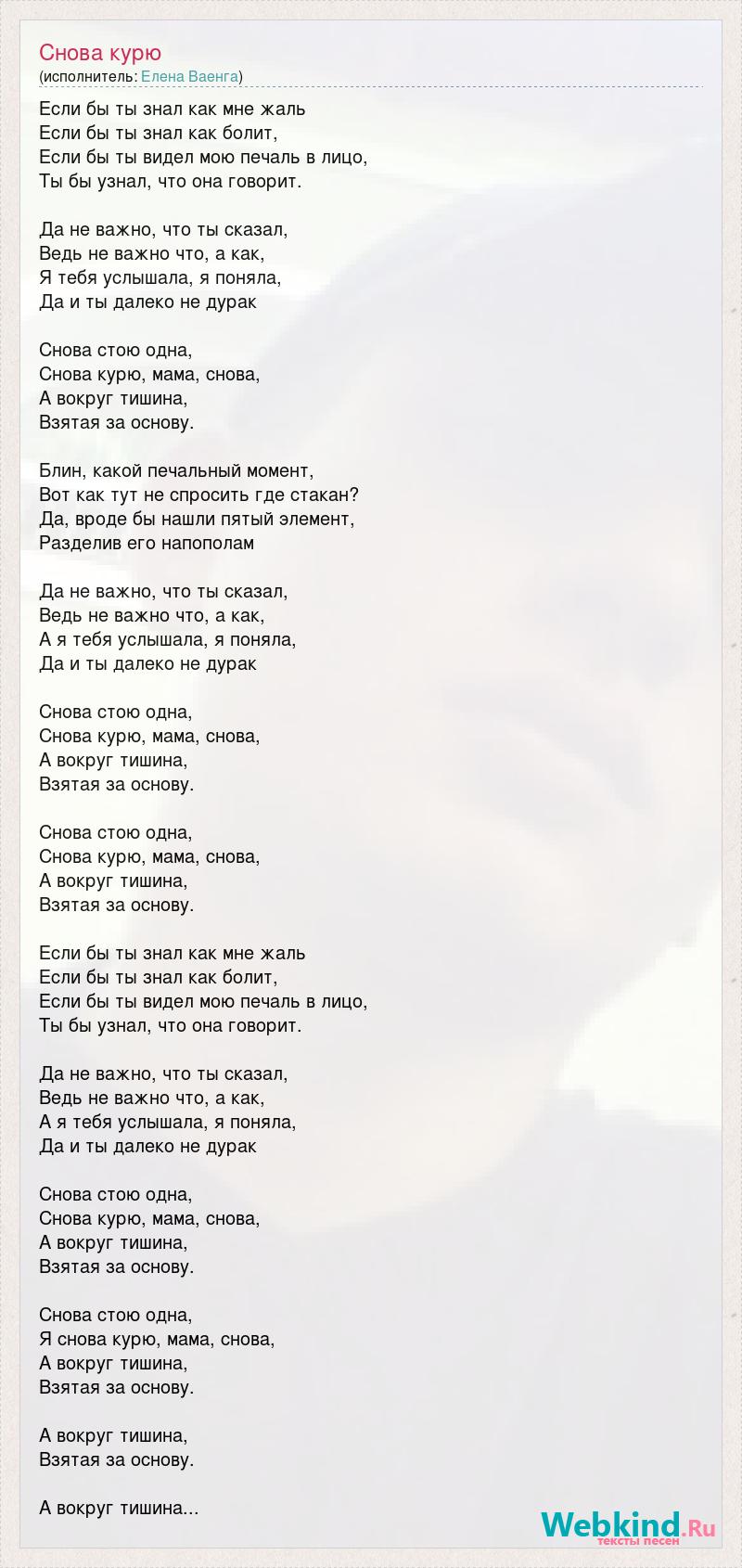 Если бы ты знал как мне жаль Если бы ты знал как болит, Если бы ты видел мою печаль в лицо, Ты бы узнал, что она говорит. Да не важно, что ты сказал, Ведь не важно что, а как, Я тебя услышала, я поняла, Да и ты далеко не дурак Снова стою одна, Снова курю, мама, снова, А вокруг тишина, Взятая за основу. Блин, какой печальный момент, Вот как тут не спросить где стакан? Да, вроде бы нашли пятый элемент, Разделив его напополам Да не важно, что ты сказал, Ведь не важно что, а как, А я тебя услышала, я поняла, Да и ты далеко не дурак Снова стою одна, Снова курю, мама, снова, А вокруг тишина, Взятая за основу. Снова стою одна, Снова курю, мама, снова, А вокруг тишина, Взятая за основу. Если бы ты знал как мне жаль Если бы ты знал как болит, Если бы ты видел мою печаль в лицо, Ты бы узнал, что она говорит. Да не важно, что ты сказал, Ведь не важно что, а как, А я тебя услышала, я поняла, Да и ты далеко не дурак Снова стою одна, Снова курю, мама, снова, А вокруг тишина, Взятая за основу. Снова стою одна, Я снова курю, мама, снова, А вокруг тишина, Взятая за основу. А вокруг тишина, Взятая за основу. А вокруг тишина...