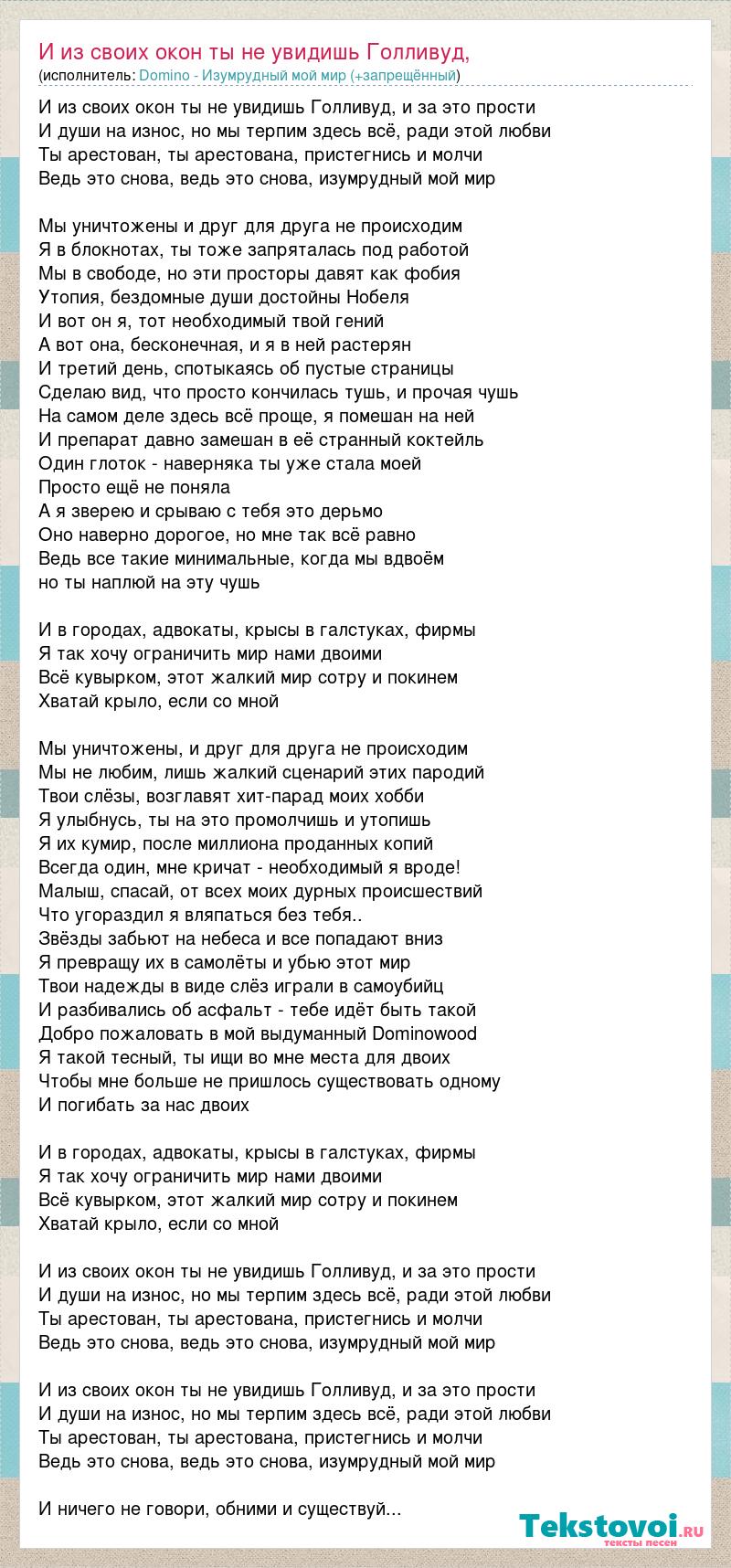 И из своих окон ты не увидишь Голливуд, и за это прости И души на износ, но мы терпим здесь всё, ради этой любви Ты арестован, ты арестована, пристегнись и молчи Ведь это снова, ведь это снова, изумрудный мой мир Мы уничтожены и друг для друга не происходим Я в блокнотах, ты тоже запряталась под работой Мы в свободе, но эти просторы давят как фобия Утопия, бездомные души достойны Нобеля И вот он я, тот необходимый твой гений А вот она, бесконечная, и я в ней растерян И третий день, спотыкаясь об пустые страницы Сделаю вид, что просто кончилась тушь, и прочая чушь На самом деле здесь всё проще, я помешан на ней И препарат давно замешан в её странный коктейль Один глоток - наверняка ты уже стала моей Просто ещё не поняла А я зверею и срываю с тебя это дерьмо Оно наверно дорогое, но мне так всё равно Ведь все такие минимальные, когда мы вдвоём но ты наплюй на эту чушь И в городах, адвокаты, крысы в галстуках, фирмы Я так хочу ограничить мир нами двоими Всё кувырком, этот жалкий мир сотру и покинем Хватай крыло, если со мной Мы уничтожены, и друг для друга не происходим Мы не любим, лишь жалкий сценарий этих пародий Твои слёзы, возглавят хит-парад моих хобби Я улыбнусь, ты на это промолчишь и утопишь Я их кумир, после миллиона проданных копий Всегда один, мне кричат - необходимый я вроде! Малыш, спасай, от всех моих дурных происшествий Что угораздил я вляпаться без тебя.. Звёзды забьют на небеса и все попадают вниз Я превращу их в самолёты и убью этот мир Твои надежды в виде слёз играли в самоубийц И разбивались об асфальт - тебе идёт быть такой Добро пожаловать в мой выдуманный Dominowood Я такой тесный, ты ищи во мне места для двоих Чтобы мне больше не пришлось существовать одному И погибать за нас двоих И в городах, адвокаты, крысы в галстуках, фирмы Я так хочу ограничить мир нами двоими Всё кувырком, этот жалкий мир сотру и покинем Хватай крыло, если со мной И из своих окон ты не увидишь Голливуд, и за это прости И души на износ, но мы терпим здесь всё, ради этой любви Ты арестован, ты арестована, пристегнись и молчи Ведь это снова, ведь это снова, изумрудный мой мир И из своих окон ты не увидишь Голливуд, и за это прости И души на износ, но мы терпим здесь всё, ради этой любви Ты арестован, ты арестована, пристегнись и молчи Ведь это снова, ведь это снова, изумрудный мой мир И ничего не говори, обними и существуй...