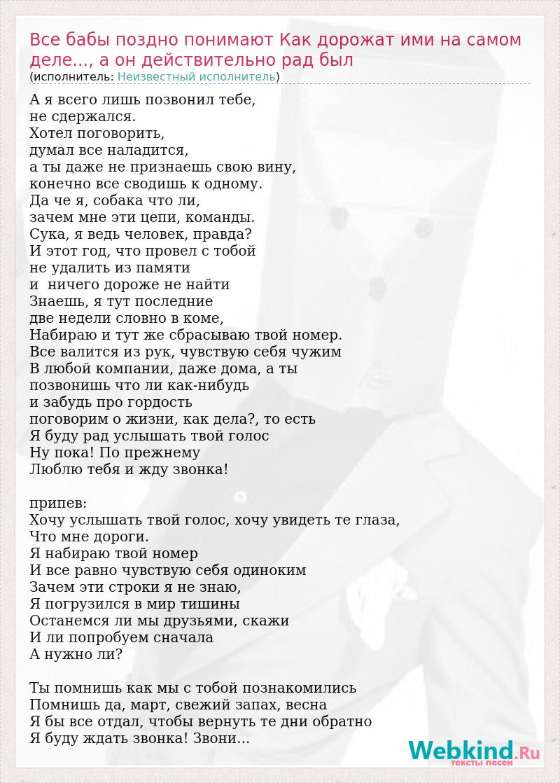 Все бабы поздно понимают Как дорожат ими на самом деле..., а он действител