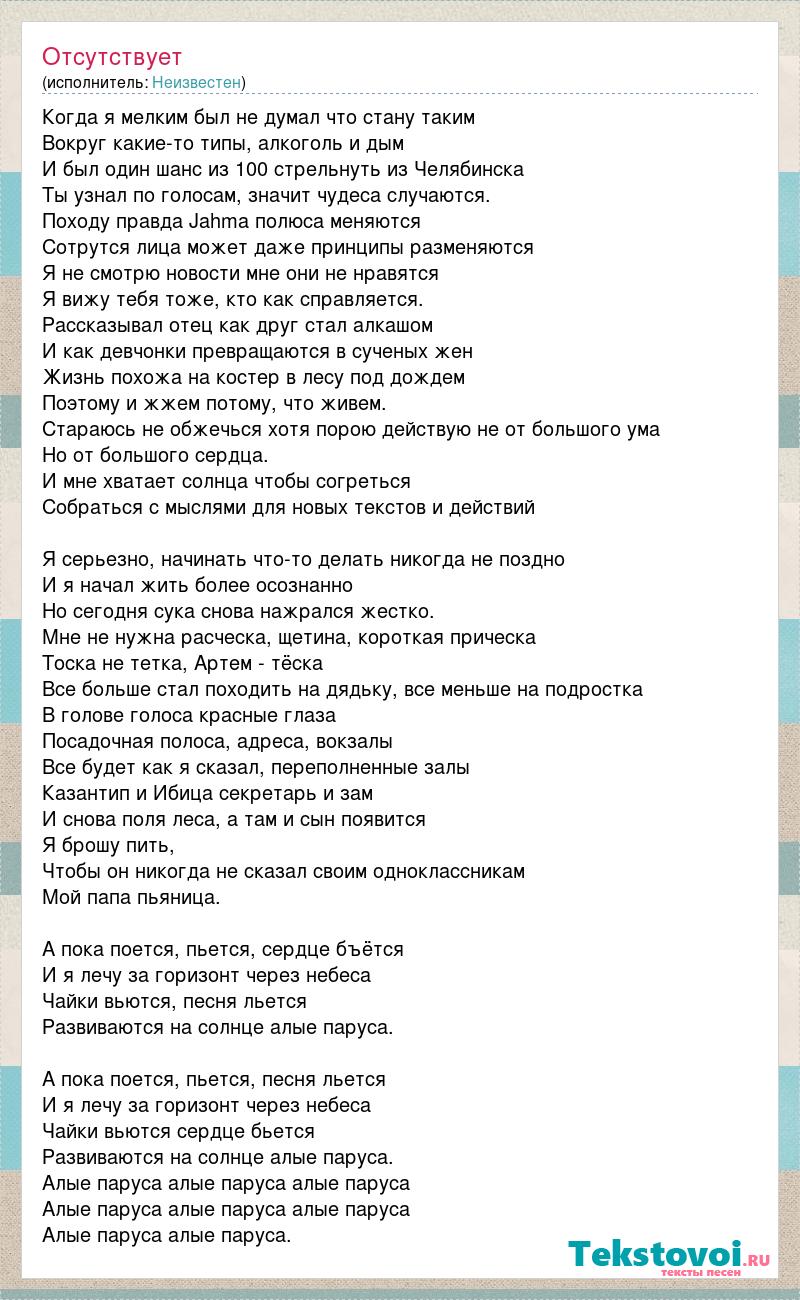 Когда я мелким был не думал что стану таким Вокруг какие-то типы, алкоголь и дым И был один шанс из 100 стрельнуть из Челябинска Ты узнал по голосам, значит чудеса случаются. Походу правда Jahma полюса меняются Сотрутся лица может даже принципы разменяются Я не смотрю новости мне они не нравятся Я вижу тебя тоже, кто как справляется. Рассказывал отец как друг стал алкашом И как девчонки превращаются в сученых жен Жизнь похожа на костер в лесу под дождем Поэтому и жжем потому, что живем. Стараюсь не обжечься хотя порою действую не от большого ума Но от большого сердца. И мне хватает солнца чтобы согреться Собраться с мыслями для новых текстов и действий Я серьезно, начинать что-то делать никогда не поздно И я начал жить более осознанно Но сегодня сука снова нажрался жестко. Мне не нужна расческа, щетина, короткая прическа Тоска не тетка, Артем - тёска Все больше стал походить на дядьку, все меньше на подростка В голове голоса красные глаза Посадочная полоса, адреса, вокзалы Все будет как я сказал, переполненные залы Казантип и Ибица секретарь и зам И снова поля леса, а там и сын появится Я брошу пить, Чтобы он никогда не сказал своим одноклассникам Мой папа пьяница. А пока поется, пьется, сердце бъётся И я лечу за горизонт через небеса Чайки вьются, песня льется Развиваются на солнце алые паруса. А пока поется, пьется, песня льется И я лечу за горизонт через небеса Чайки вьются сердце бьется Развиваются на солнце алые паруса. Алые паруса алые паруса алые паруса Алые паруса алые паруса алые паруса Алые паруса алые паруса.