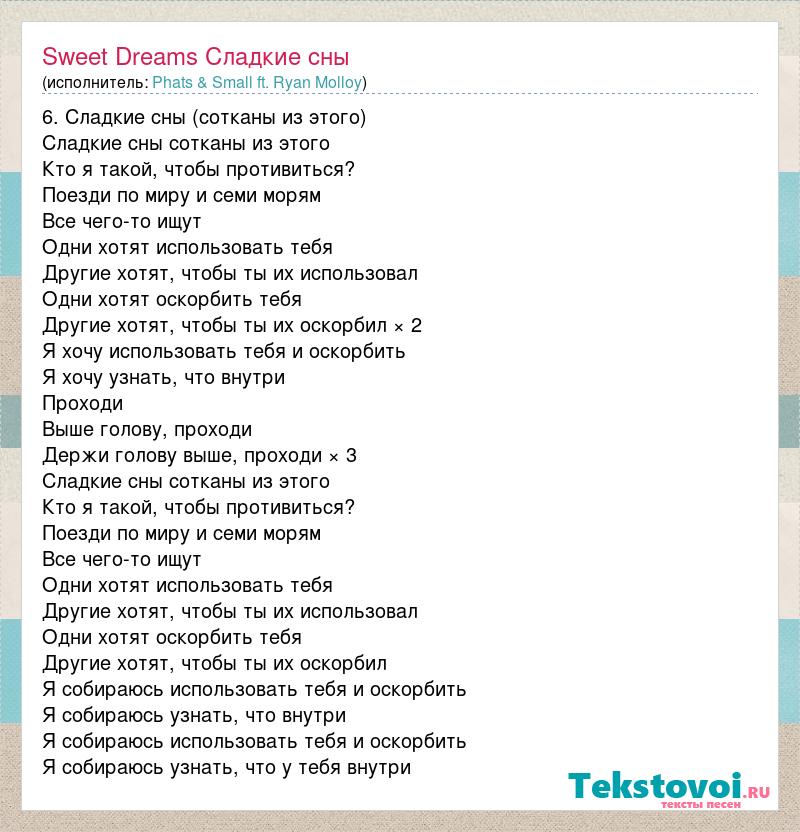 6. Сладкие сны (сотканы из этого) Сладкие сны сотканы из этого Кто я такой, чтобы противиться? Поезди по миру и семи морям Все чего-то ищут Одни хотят использовать тебя Другие хотят, чтобы ты их использовал Одни хотят оскорбить тебя Другие хотят, чтобы ты их оскорбил × 2 Я хочу использовать тебя и оскорбить Я хочу узнать, что внутри Проходи Выше голову, проходи Держи голову выше, проходи × 3 Сладкие сны сотканы из этого Кто я такой, чтобы противиться? Поезди по миру и семи морям Все чего-то ищут Одни хотят использовать тебя Другие хотят, чтобы ты их использовал Одни хотят оскорбить тебя Другие хотят, чтобы ты их оскорбил Я собираюсь использовать тебя и оскорбить Я собираюсь узнать, что внутри Я собираюсь использовать тебя и оскорбить Я собираюсь узнать, что у тебя внутри