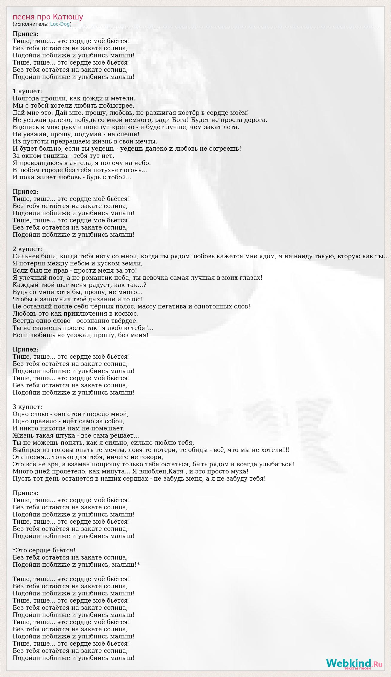 Припев: Тише, тише... это сердце моё бьётся! Без тебя остаётся на закате солнца, Подойди поближе и улыбнись малыш! Тише, тише... это сердце моё бьётся! Без тебя остаётся на закате солнца, Подойди поближе и улыбнись малыш! 1 куплет: Полгода прошли, как дожди и метели. Мы с тобой хотели любить побыстрее, Дай мне это. Дай мне, прошу, любовь, не разжигая костёр в сердце моём! Не уезжай далеко, побудь со мной немного, ради Бога! Будет не проста дорога. Вцепись в мою руку и поцелуй крепко - и будет лучше, чем закат лета. Не уезжай, прошу, подумай - не спеши! Из пустоты превращаем жизнь в свои мечты. И будет больно, если ты уедешь - уедешь далеко и любовь не согреешь! За окном тишина - тебя тут нет, Я превращаюсь в ангела, я полечу на небо. В любом городе без тебя потухнет огонь... И пока живет любовь - будь с тобой... Припев: Тише, тише... это сердце моё бьётся! Без тебя остаётся на закате солнца, Подойди поближе и улыбнись малыш! Тише, тише... это сердце моё бьётся! Без тебя остаётся на закате солнца, Подойди поближе и улыбнись малыш! 2 куплет: Сильнее боли, когда тебя нету со мной, когда ты рядом любовь кажется мне ядом, я не найду такую, вторую как ты... Я потерян между небом и куском земли, Если был не прав - прости меня за это! Я улечный поэт, а не романтик неба, ты девочка самая лучшая в моих глазах! Каждый твой шаг меня радует, как так...? Будь со мной хотя бы, прошу, не много... Чтобы я запомнил твоё дыхание и голос! Не оставляй после себя чёрных полос, массу негатива и однотонных слов! Любовь это как приключения в космос. Всегда одно слово - осознанно твёрдое. Ты не скажешь просто так "я люблю тебя"... Если любишь не уезжай, прошу, без меня! Припев: Тише, тише... это сердце моё бьётся! Без тебя остаётся на закате солнца, Подойди поближе и улыбнись малыш! Тише, тише... это сердце моё бьётся! Без тебя остаётся на закате солнца, Подойди поближе и улыбнись малыш! 3 куплет: Одно слово - оно стоит передо мной, Одно правило - идёт само за собой, И никто никогда нам не помешает, Жизнь такая штука - всё сама решает... Ты не можешь понять, как я сильно, сильно люблю тебя, Выбирая из головы опять те мечты, ловя те потери, те обиды - всё, что мы не хотели!!! Эта песня... только для тебя, ничего не говори, Это всё не зря, а взамен попрошу только тебя остаться, быть рядом и всегда улыбаться! Много дней пролетело, как минута... Я влюблен,Катя , и это просто мука! Пусть тот день останется в наших сердцах - не забудь меня, а я не забуду тебя! Припев: Тише, тише... это сердце моё бьётся! Без тебя остаётся на закате солнца, Подойди поближе и улыбнись малыш! Тише, тише... это сердце моё бьётся! Без тебя остаётся на закате солнца, Подойди поближе и улыбнись малыш! *Это сердце бьётся! Без тебя остаётся на закате солнца, Подойди поближе и улыбнись, малыш!* Тише, тише... это сердце моё бьётся! Без тебя остаётся на закате солнца, Подойди поближе и улыбнись малыш! Тише, тише... это сердце моё бьётся! Без тебя остаётся на закате солнца, Подойди поближе и улыбнись малыш! Тише, тише... это сердце моё бьётся! Без тебя остаётся на закате солнца, Подойди поближе и улыбнись малыш! Тише, тише... это сердце моё бьётся! Без тебя остаётся на закате солнца, Подойди поближе и улыбнись малыш!