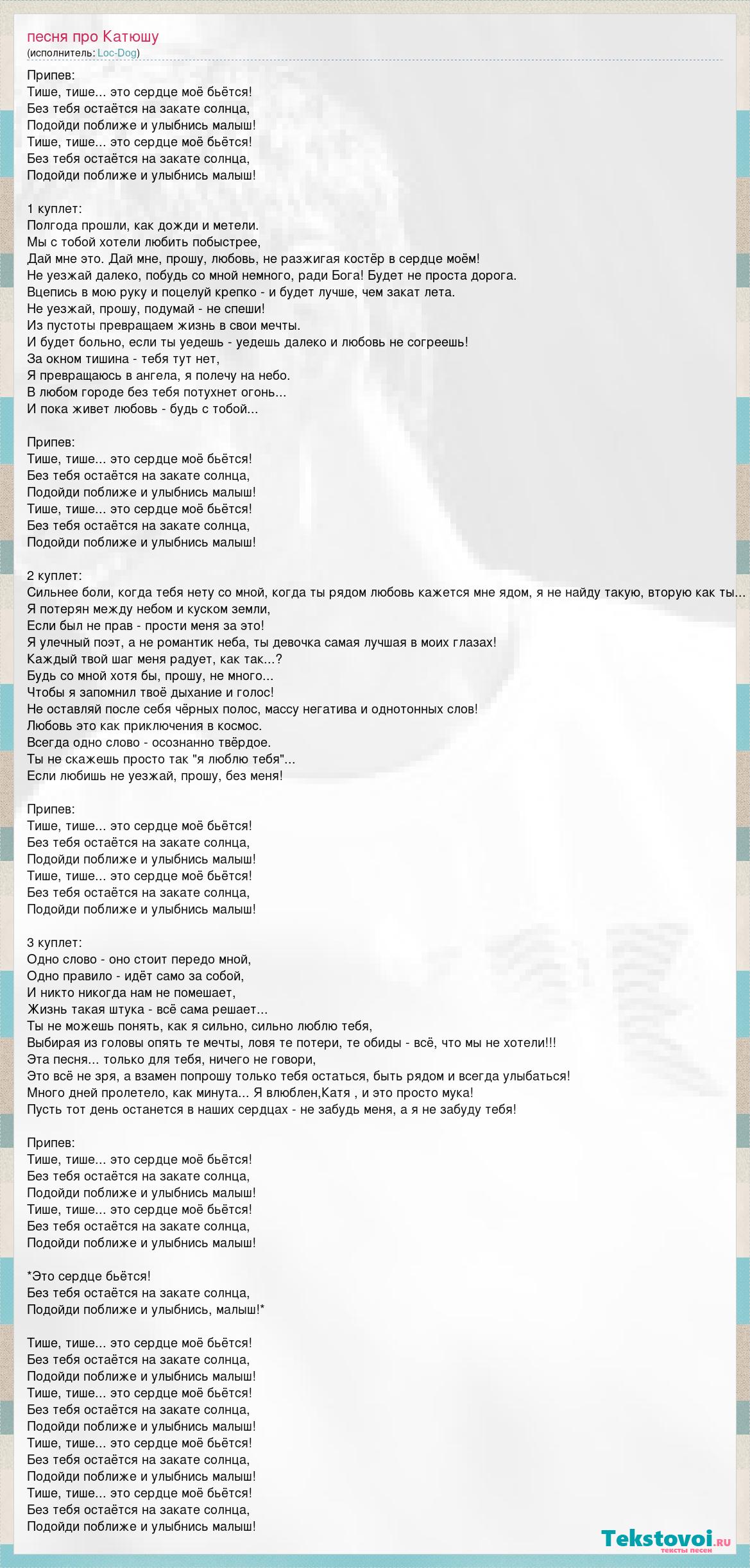 Припев: Тише, тише... это сердце моё бьётся! Без тебя остаётся на закате солнца, Подойди поближе и улыбнись малыш! Тише, тише... это сердце моё бьётся! Без тебя остаётся на закате солнца, Подойди поближе и улыбнись малыш! 1 куплет: Полгода прошли, как дожди и метели. Мы с тобой хотели любить побыстрее, Дай мне это. Дай мне, прошу, любовь, не разжигая костёр в сердце моём! Не уезжай далеко, побудь со мной немного, ради Бога! Будет не проста дорога. Вцепись в мою руку и поцелуй крепко - и будет лучше, чем закат лета. Не уезжай, прошу, подумай - не спеши! Из пустоты превращаем жизнь в свои мечты. И будет больно, если ты уедешь - уедешь далеко и любовь не согреешь! За окном тишина - тебя тут нет, Я превращаюсь в ангела, я полечу на небо. В любом городе без тебя потухнет огонь... И пока живет любовь - будь с тобой... Припев: Тише, тише... это сердце моё бьётся! Без тебя остаётся на закате солнца, Подойди поближе и улыбнись малыш! Тише, тише... это сердце моё бьётся! Без тебя остаётся на закате солнца, Подойди поближе и улыбнись малыш! 2 куплет: Сильнее боли, когда тебя нету со мной, когда ты рядом любовь кажется мне ядом, я не найду такую, вторую как ты... Я потерян между небом и куском земли, Если был не прав - прости меня за это! Я улечный поэт, а не романтик неба, ты девочка самая лучшая в моих глазах! Каждый твой шаг меня радует, как так...? Будь со мной хотя бы, прошу, не много... Чтобы я запомнил твоё дыхание и голос! Не оставляй после себя чёрных полос, массу негатива и однотонных слов! Любовь это как приключения в космос. Всегда одно слово - осознанно твёрдое. Ты не скажешь просто так "я люблю тебя"... Если любишь не уезжай, прошу, без меня! Припев: Тише, тише... это сердце моё бьётся! Без тебя остаётся на закате солнца, Подойди поближе и улыбнись малыш! Тише, тише... это сердце моё бьётся! Без тебя остаётся на закате солнца, Подойди поближе и улыбнись малыш! 3 куплет: Одно слово - оно стоит передо мной, Одно правило - идёт само за собой, И никто никогда нам не помешает, Жизнь такая штука - всё сама решает... Ты не можешь понять, как я сильно, сильно люблю тебя, Выбирая из головы опять те мечты, ловя те потери, те обиды - всё, что мы не хотели!!! Эта песня... только для тебя, ничего не говори, Это всё не зря, а взамен попрошу только тебя остаться, быть рядом и всегда улыбаться! Много дней пролетело, как минута... Я влюблен,Катя , и это просто мука! Пусть тот день останется в наших сердцах - не забудь меня, а я не забуду тебя! Припев: Тише, тише... это сердце моё бьётся! Без тебя остаётся на закате солнца, Подойди поближе и улыбнись малыш! Тише, тише... это сердце моё бьётся! Без тебя остаётся на закате солнца, Подойди поближе и улыбнись малыш! *Это сердце бьётся! Без тебя остаётся на закате солнца, Подойди поближе и улыбнись, малыш!* Тише, тише... это сердце моё бьётся! Без тебя остаётся на закате солнца, Подойди поближе и улыбнись малыш! Тише, тише... это сердце моё бьётся! Без тебя остаётся на закате солнца, Подойди поближе и улыбнись малыш! Тише, тише... это сердце моё бьётся! Без тебя остаётся на закате солнца, Подойди поближе и улыбнись малыш! Тише, тише... это сердце моё бьётся! Без тебя остаётся на закате солнца, Подойди поближе и улыбнись малыш!