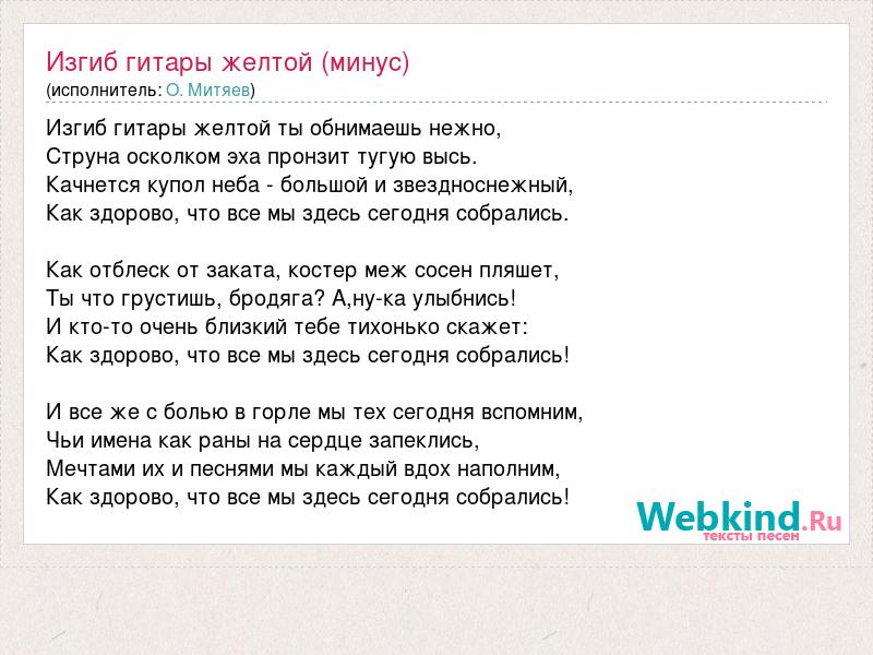 Изгиб гитары желтой ты обнимаешь нежно, Струна осколком эха пронзит тугую высь. Качнется купол неба - большой и звездноснежный, Как здорово, что все мы здесь сегодня собрались. Как отблеск от заката, костер меж сосен пляшет, Ты что грустишь, бродяга? А,ну-ка улыбнись! И кто-то очень близкий тебе тихонько скажет: Как здорово, что все мы здесь сегодня собрались! И все же с болью в горле мы тех сегодня вспомним, Чьи имена как раны на сердце запеклись, Мечтами их и песнями мы каждый вдох наполним, Как здорово, что все мы здесь сегодня собрались!