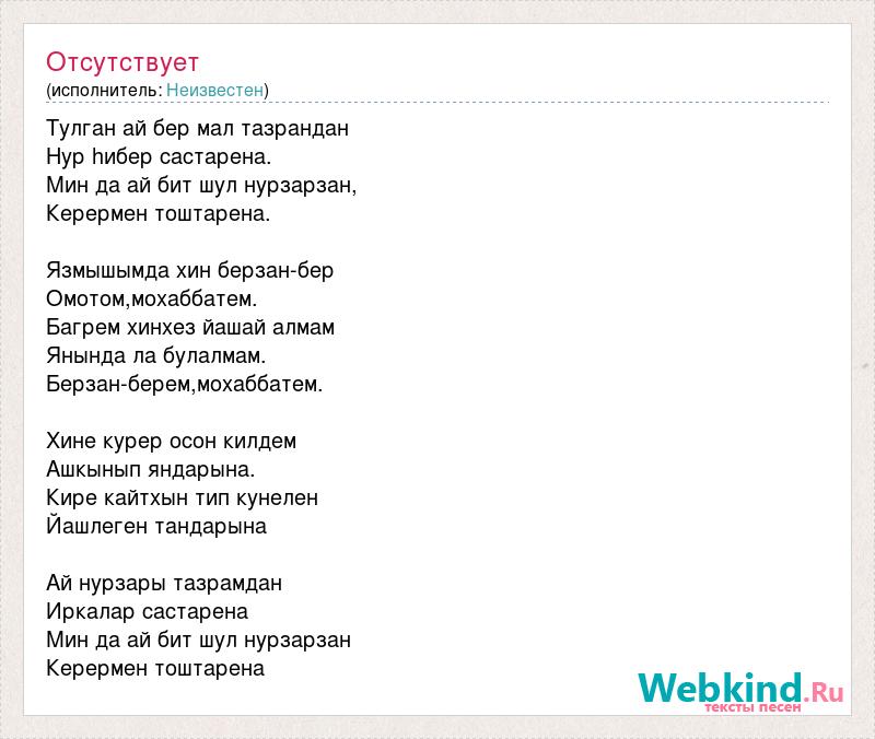Тулган ай бер мал тазрандан Нур hибер састарена. Мин да ай бит шул нурзарзан, Керермен тоштарена. Язмышымда хин берзан-бер Омотом,мохаббатем. Багрем хинхез йашай алмам Янында ла булалмам. Берзан-берем,мохаббатем. Хине курер осон килдем Ашкынып яндарына. Кире кайтхын тип кунелен Йашлеген тандарына Ай нурзары тазрамдан Иркалар састарена Мин да ай бит шул нурзарзан Керермен тоштарена
