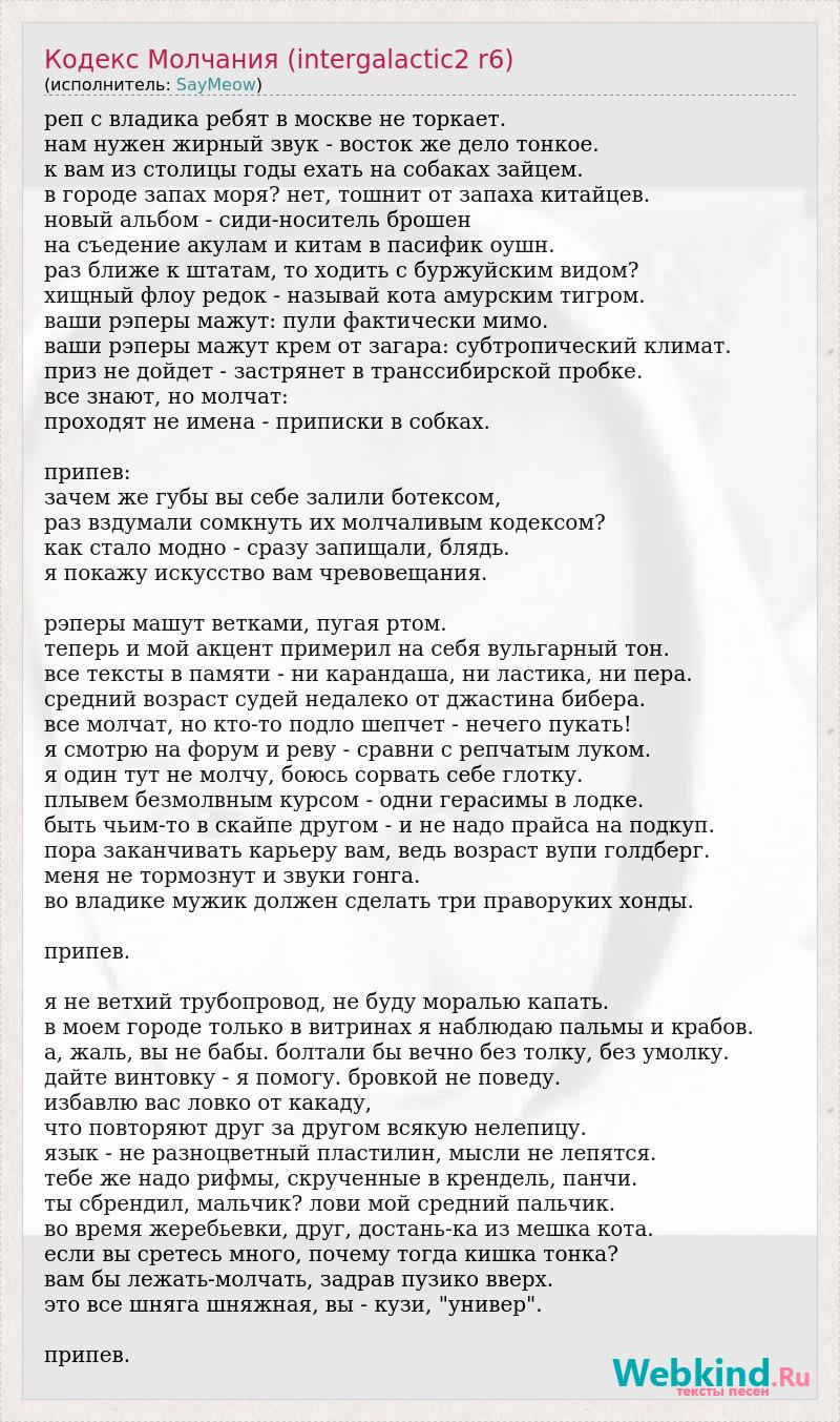 реп с владика ребят в москве не торкает. нам нужен жирный звук - восток же дело тонкое. к вам из столицы годы ехать на собаках зайцем. в городе запах моря? нет, тошнит от запаха китайцев. новый альбом - сиди-носитель брошен на съедение акулам и китам в пасифик оушн. раз ближе к штатам, то ходить с буржуйским видом? хищный флоу редок - называй кота амурским тигром. ваши рэперы мажут: пули фактически мимо. ваши рэперы мажут крем от загара: субтропический климат. приз не дойдет - застрянет в транссибирской пробке. все знают, но молчат: проходят не имена - приписки в собках. припев: зачем же губы вы себе залили ботексом, раз вздумали сомкнуть их молчаливым кодексом? как стало модно - сразу запищали, блядь. я покажу искусство вам чревовещания. рэперы машут ветками, пугая ртом. теперь и мой акцент примерил на себя вульгарный тон. все тексты в памяти - ни карандаша, ни ластика, ни пера. средний возраст судей недалеко от джастина бибера. все молчат, но кто-то подло шепчет - нечего пукать! я смотрю на форум и реву - сравни с репчатым луком. я один тут не молчу, боюсь сорвать себе глотку. плывем безмолвным курсом - одни герасимы в лодке. быть чьим-то в скайпе другом - и не надо прайса на подкуп. пора заканчивать карьеру вам, ведь возраст вупи голдберг. меня не тормознут и звуки гонга. во владике мужик должен сделать три праворуких хонды. припев. я не ветхий трубопровод, не буду моралью капать. в моем городе только в витринах я наблюдаю пальмы и крабов. а, жаль, вы не бабы. болтали бы вечно без толку, без умолку. дайте винтовку - я помогу. бровкой не поведу. избавлю вас ловко от какаду, что повторяют друг за другом всякую нелепицу. язык - не разноцветный пластилин, мысли не лепятся. тебе же надо рифмы, скрученные в крендель, панчи. ты сбрендил, мальчик? лови мой средний пальчик. во время жеребьевки, друг, достань-ка из мешка кота. если вы сретесь много, почему тогда кишка тонка? вам бы лежать-молчать, задрав пузико вверх. это все шняга шняжная, вы - кузи, "универ". припев.