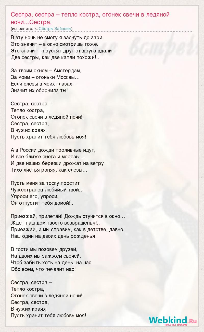 В эту ночь не смогу я заснуть до зари, Это значит – в окно смотришь тоже. Это значит – грустят друг от друга вдали Две сестры, как две капли похожи!.. За твоим окном – Амстердам, За моим – огоньки Москвы… Если слезы в моих глазах – Значит их обронила ты! Сестра, сестра – Тепло костра, Огонек свечи в ледяной ночи! Сестра, сестра, В чужих краях Пусть хранит тебя любовь моя! А в России дожди проливные идут, И все ближе снега и морозы… И две наших березки дрожат на ветру Тихо листья роняя, как слезы… Пусть меня за тоску простит Чужестранец любимый твой… Упроси его, упроси, Он отпустит тебя домой!.. Приезжай, прилетай! Дождь стучится в окно… Ждет наш дом твоего возвращенья!.. Приезжай, и мы справим, как в детстве, давно, Наш один на двоих день рожденья! В гости мы позовем друзей, На двоих мы зажжем свечей, Чтоб забыть хоть на день, на час Обо всем, что печалит нас! Сестра, сестра – Тепло костра, Огонек свечи в ледяной ночи! Сестра, сестра, В чужих краях Пусть хранит тебя любовь моя!