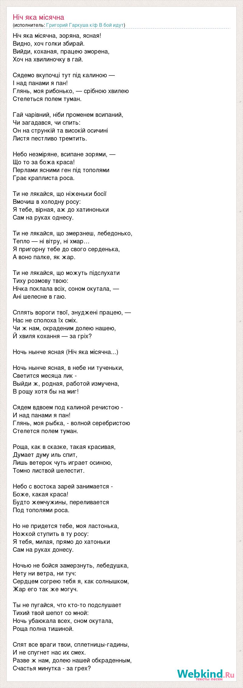 Нiч яка мiсячна, зоряна, ясная! Видно, хоч голки збирай. Вийди, коханая, працею зморена, Хоч на хвилиночку в гай. Сядемо вкупочцi тут пiд калиною — I над панами я пан! Глянь, моя рибонько, — срiбною хвилею Стелеться полем туман. Гай чарiвний, нiби променем всипаний, Чи загадався, чи спить: Он на стрункiй та високiй осичинi Листя пестливо тремтить. Небо незмiряне, всипане зорями, — Що то за божа краса! Перлами ясними ген пiд тополями Грає краплиста роса. Ти не лякайся, що нiженьки босiї Вмочиш в холодну росу: Я тебе, вiрная, аж до хатиноньки Сам на руках однесу. Ти не лякайся, що змерзнеш, лебедонько, Тепло — нi вiтру, нi хмар… Я пригорну тебе до свого серденька, А воно палке, як жар. Ти не лякайся, що можуть пiдслухати Тиху розмову твою: Нiчка поклала всiх, соном окутала, — Анi шелесне в гаю. Сплять вороги твої, знудженi працею, — Нас не сполоха їх смiх. Чи ж нам, окраденим долею нашею, Й хвиля кохання — за грiх? Ночь нынче ясная (Нiч яка мiсячна...) Ночь нынче ясная, в небе ни тученьки, Светится месяца лик - Выйди ж, родная, работой измучена, В рощу хотя бы на миг! Сядем вдвоем под калиной речистою - И над панами я пан! Глянь, моя рыбка, - волной серебристою Стелется полем туман. Роща, как в сказке, такая красивая, Думает думу иль спит, Лишь ветерок чуть играет осиною, Томно листвой шелестит. Небо с востока зарей занимается - Боже, какая краса! Будто жемчужины, переливается Под тополями роса. Но не придется тебе, моя ластонька, Ножкой ступить в ту росу: Я тебя, милая, прямо до хатоньки Сам на руках донесу. Ночью не бойся замерзнуть, лебедушка, Нету ни ветра, ни туч: Сердцем согрею тебя я, как солнышком, Жар его так же могуч. Ты не пугайся, что кто-то подслушает Тихий твой шепот со мной: Ночь убаюкала всех, сном окутала, Роща полна тишиной. Спят все враги твои, сплетницы-гадины, И не спугнет нас их смех. Разве ж нам, долею нашей обкраденным, Счастья минутка - за грех?
