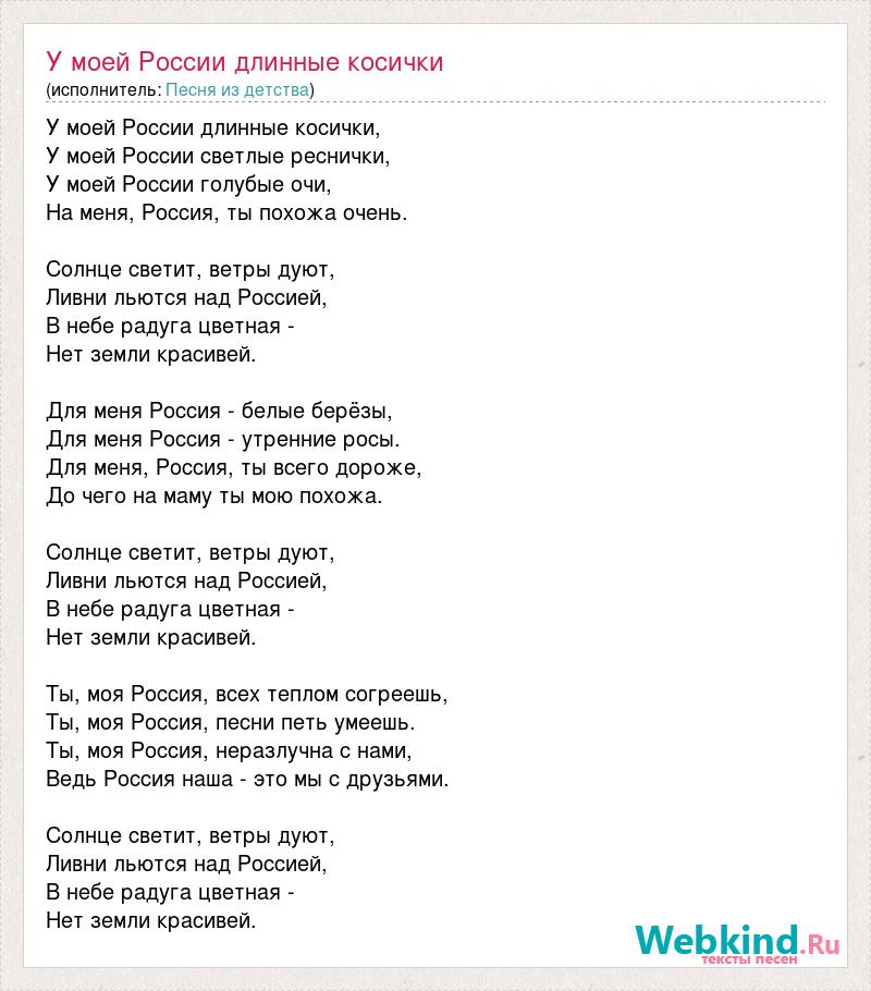 У моей России длинные косички, У моей России светлые реснички, У моей России голубые очи, На меня, Россия, ты похожа очень. Солнце светит, ветры дуют, Ливни льются над Россией, В небе радуга цветная - Нет земли красивей. Для меня Россия - белые берёзы, Для меня Россия - утренние росы. Для меня, Россия, ты всего дороже, До чего на маму ты мою похожа. Солнце светит, ветры дуют, Ливни льются над Россией, В небе радуга цветная - Нет земли красивей. Ты, моя Россия, всех теплом согреешь, Ты, моя Россия, песни петь умеешь. Ты, моя Россия, неразлучна с нами, Ведь Россия наша - это мы с друзьями. Солнце светит, ветры дуют, Ливни льются над Россией, В небе радуга цветная - Нет земли красивей.