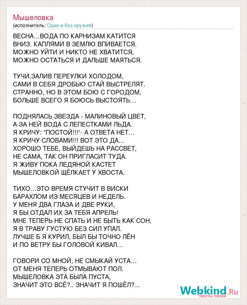 ВЕСНА…ВОДА ПО КАРНИЗАМ КАТИТСЯ ВНИЗ. КАПЛЯМИ В ЗЕМЛЮ ВПИВАЕТСЯ. МОЖНО УЙТИ И НИКТО НЕ ХВАТИТСЯ, МОЖНО ОСТАТЬСЯ И ДАЛЬШЕ МАЯТЬСЯ. ТУЧИ,ЗАЛИВ ПЕРЕУЛКИ ХОЛОДОМ, САМИ В СЕБЯ ДРОБЬЮ СТАЙ ВЫСТРЕЛЯТ. СТРАННО, НО В ЭТОМ БОЮ С ГОРОДОМ, БОЛЬШЕ ВСЕГО Я БОЮСЬ ВЫСТОЯТЬ… ПОДНЯЛАСЬ ЗВЕЗДА - МАЛИНОВЫЙ ЦВЕТ, А ЗА НЕЙ ВОДА С ЛЕПЕСТКАМИ ЛЬДА. Я КРИЧУ: ”ПОСТОЙ!!!”- А ОТВЕТА НЕТ… Я КРИЧУ СЛОВАМИ!!! ВОТ ЭТО ДА… ХОРОШО ТЕБЕ, ВЫЙДЕШЬ НА РАССВЕТ, НЕ САМА, ТАК ОН ПРИГЛАСИТ ТУДА. Я ЖИВУ ПОКА ЛЕДЯНОЙ КАСТЕТ МЫШЕЛОВКОЙ ЩЁЛКАЕТ У ХВОСТА. ТИХО…ЭТО ВРЕМЯ СТУЧИТ В ВИСКИ БАРАХЛОМ ИЗ МЕСЯЦЕВ И НЕДЕЛЬ. У МЕНЯ ДВА ГЛАЗА И ДВЕ РУКИ, Я БЫ ОТДАЛ ИХ ЗА ТЕБЯ АПРЕЛЬ! МНЕ ТЕПЕРЬ НЕ СПАТЬ И НЕ БЫТЬ КАК СОН, Я В ТРАВУ ГУСТУЮ БЕЗ СИЛ УПАЛ. ЛУЧШЕ Б Я КУРИЛ, БЫЛ БЫ ТОЧНО ЛЁН И ПО ВЕТРУ БЫ ГОЛОВОЙ КИВАЛ… ГОВОРИ СО МНОЙ, НЕ СМЫКАЙ УСТА… ОТ МЕНЯ ТЕПЕРЬ ОТМЫВАЮТ ПОЛ. МЫШЕЛОВКА ЭТА БЫЛА ПУСТА, ЗНАЧИТ ЭТО ВСЁ?.. ЗНАЧИТ Я ПОШЁЛ?...