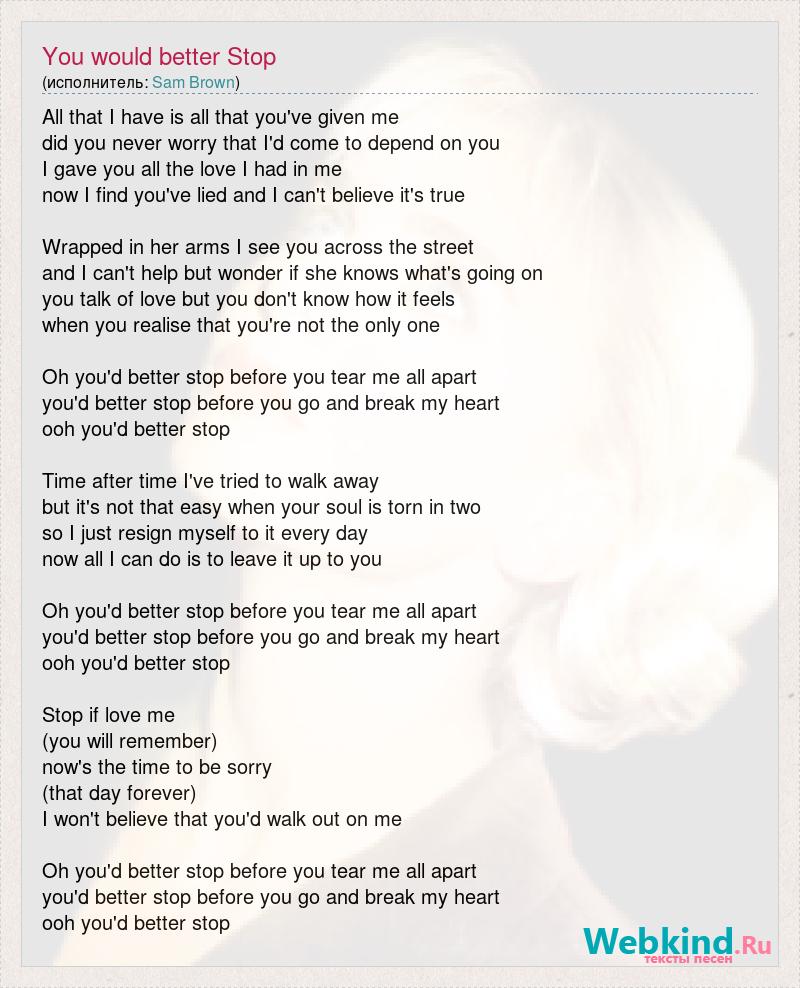 All that I have is all that you've given me did you never worry that I'd come to depend on you I gave you all the love I had in me now I find you've lied and I can't believe it's true Wrapped in her arms I see you across the street and I can't help but wonder if she knows what's going on you talk of love but you don't know how it feels when you realise that you're not the only one Oh you'd better stop before you tear me all apart you'd better stop before you go and break my heart ooh you'd better stop Time after time I've tried to walk away but it's not that easy when your soul is torn in two so I just resign myself to it every day now all I can do is to leave it up to you Oh you'd better stop before you tear me all apart you'd better stop before you go and break my heart ooh you'd better stop Stop if love me (you will remember) now's the time to be sorry (that day forever) I won't believe that you'd walk out on me Oh you'd better stop before you tear me all apart you'd better stop before you go and break my heart ooh you'd better stop