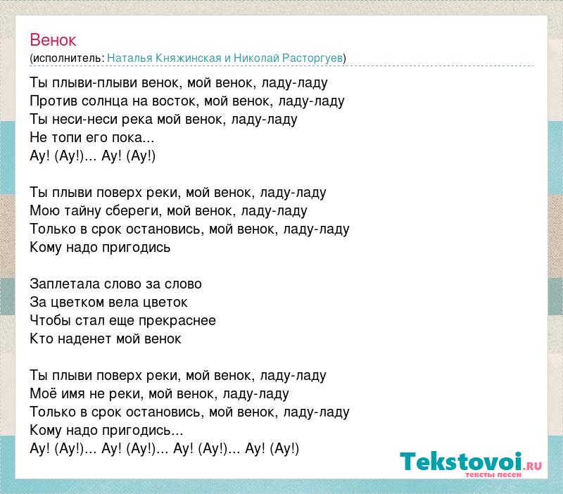 Ты плыви-плыви венок, мой венок, ладу-ладу Против солнца на восток, мой венок, ладу-ладу Ты неси-неси река мой венок, ладу-ладу Не топи его пока... Ау! (Ау!)... Ау! (Ау!) Ты плыви поверх реки, мой венок, ладу-ладу Мою тайну сбереги, мой венок, ладу-ладу Только в срок остановись, мой венок, ладу-ладу Кому надо пригодись Заплетала слово за слово За цветком вела цветок Чтобы стал еще прекраснее Кто наденет мой венок Ты плыви поверх реки, мой венок, ладу-ладу Моё имя не реки, мой венок, ладу-ладу Только в срок остановись, мой венок, ладу-ладу Кому надо пригодись... Ау! (Ау!)... Ау! (Ау!)... Ау! (Ау!)... Ау! (Ау!)