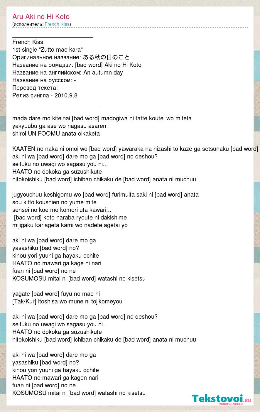 _________________________ French Kiss 1st single “Zutto mae kara” Оригинальное название: ある秋の日のこと Название на ромадзи: Aru Aki no Hi Koto Название на английском: An autumn day Название на русском: - Перевод текста: - Релиз сингла - 2010.9.8 ___________________________ mada dare mo kiteinai [bad word] madogiwa ni tatte koutei wo miteta yakyuubu ga ase wo nagasu asaren shiroi UNIFOOMU anata oikaketa KAATEN no naka ni omoi wo [bad word] yawaraka na hizashi to kaze ga setsunaku kanjiru aki ni wa [bad word] dare mo ga koisuru no deshou? seifuku no uwagi wo sagasu you ni... HAATO no dokoka ga suzushikute hitokoishiku naru ichiban chikaku de kininaru anata ni muchuu jugyouchuu keshigomu wo [bad word] furimuita saki ni nemutteru anata sou kitto koushien no yume mite sensei no koe mo komori uta kawari... dekiru koto naraba ryoute ni dakishime mijigaku kariageta kami wo nadete agetai yo aki ni wa [bad word] dare mo ga yasashiku nareru no? kinou yori yuuhi ga hayaku ochite HAATO no mawari ga kage ni nari fuan ni naru no ne KOSUMOSU mitai ni yureteru watashi no kisetsu yagate meguru fuyu no mae ni [Tak/Kur] itoshisa wo mune ni tojikomeyou aki ni wa [bad word] dare mo ga koisuru no deshou? seifuku no uwagi wo sagasu you ni... HAATO no dokoka ga suzushikute hitokoishiku naru ichiban chikaku de kininaru anata ni muchuu aki ni wa [bad word] dare mo ga yasashiku nareru no? kinou yori yuuhi ga hayaku ochite HAATO no mawari ga kagen nari fuan ni naru no ne KOSUMOSU mitai ni yureteru watashi no kisetsu
