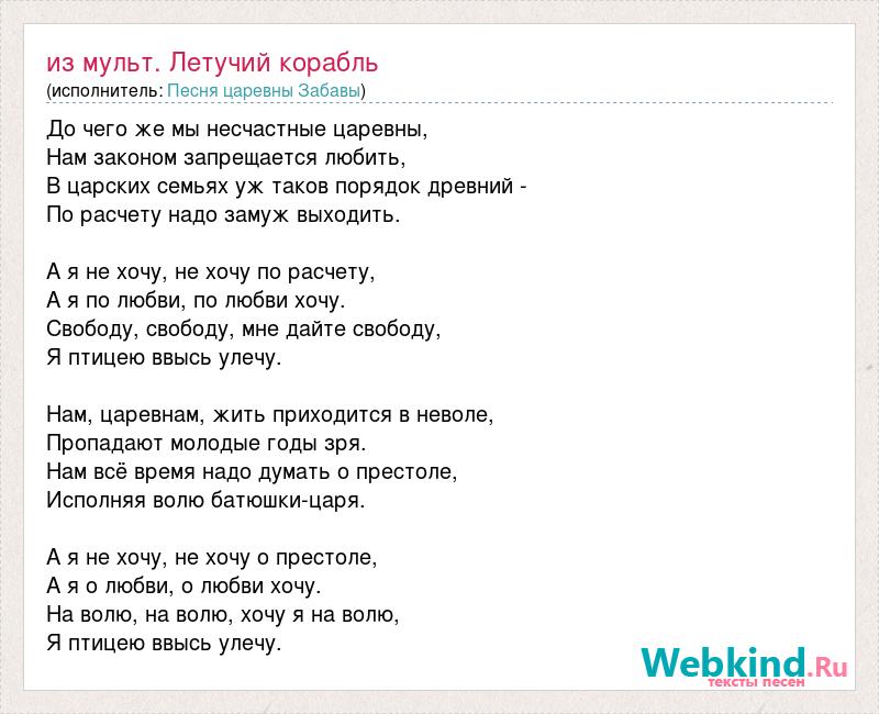 До чего же мы несчастные царевны, Нам законом запрещается любить, В царских семьях уж таков порядок древний - По расчету надо замуж выходить. А я не хочу, не хочу по расчету, А я по любви, по любви хочу. Свободу, свободу, мне дайте свободу, Я птицею ввысь улечу. Нам, царевнам, жить приходится в неволе, Пропадают молодые годы зря. Нам всё время надо думать о престоле, Исполняя волю батюшки-царя. А я не хочу, не хочу о престоле, А я о любви, о любви хочу. На волю, на волю, хочу я на волю, Я птицею ввысь улечу.