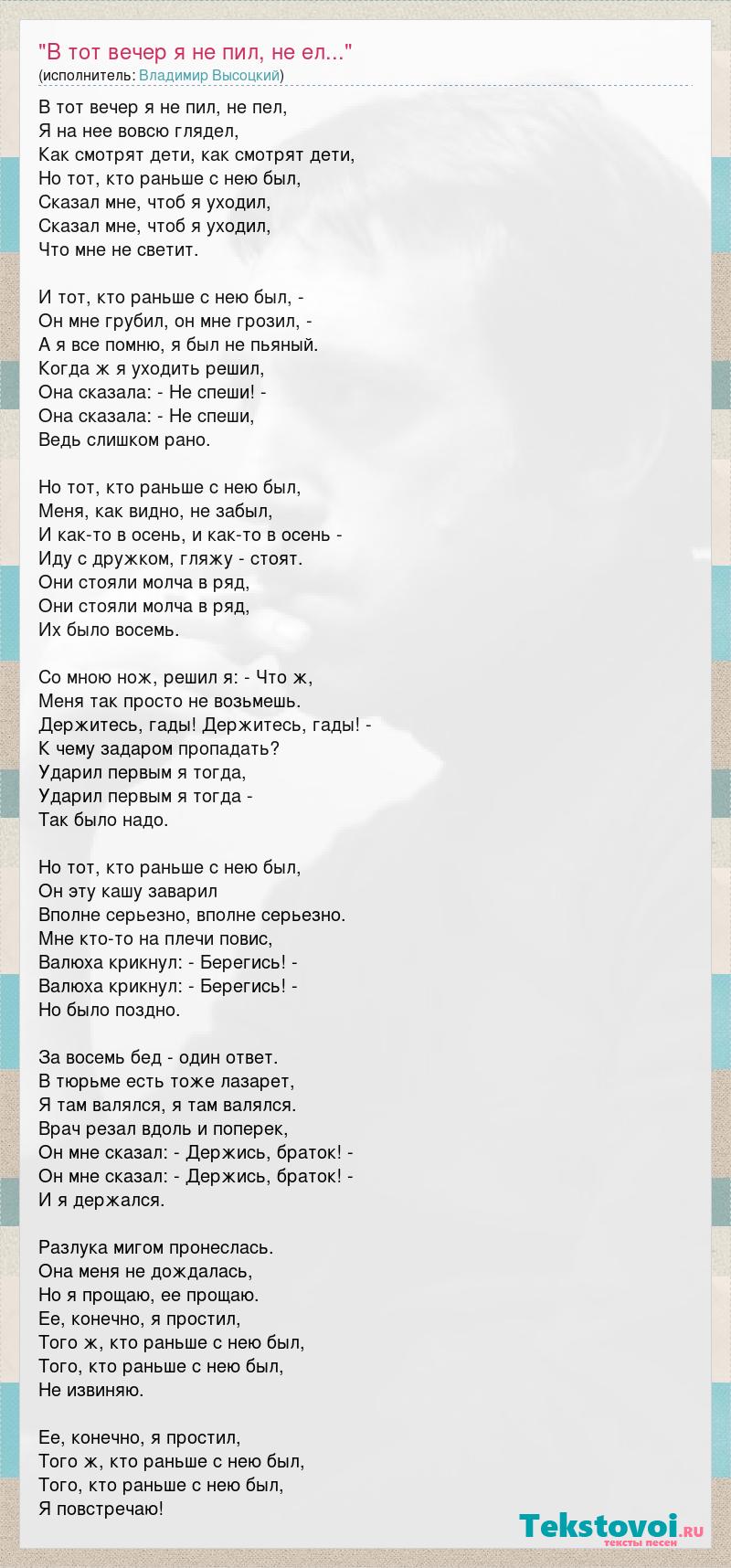 В тот вечер я не пил, не пел, Я на нее вовсю глядел, Как смотрят дети, как смотрят дети, Но тот, кто раньше с нею был, Сказал мне, чтоб я уходил, Сказал мне, чтоб я уходил, Что мне не светит. И тот, кто раньше с нею был, - Он мне грубил, он мне грозил, - А я все помню, я был не пьяный. Когда ж я уходить решил, Она сказала: - Не спеши! - Она сказала: - Не спеши, Ведь слишком рано. Но тот, кто раньше с нею был, Меня, как видно, не забыл, И как-то в осень, и как-то в осень - Иду с дружком, гляжу - стоят. Они стояли молча в ряд, Они стояли молча в ряд, Их было восемь. Со мною нож, решил я: - Что ж, Меня так просто не возьмешь. Держитесь, гады! Держитесь, гады! - К чему задаром пропадать? Ударил первым я тогда, Ударил первым я тогда - Так было надо. Но тот, кто раньше с нею был, Он эту кашу заварил Вполне серьезно, вполне серьезно. Мне кто-то на плечи повис, Валюха крикнул: - Берегись! - Валюха крикнул: - Берегись! - Но было поздно. За восемь бед - один ответ. В тюрьме есть тоже лазарет, Я там валялся, я там валялся. Врач резал вдоль и поперек, Он мне сказал: - Держись, браток! - Он мне сказал: - Держись, браток! - И я держался. Разлука мигом пронеслась. Она меня не дождалась, Но я прощаю, ее прощаю. Ее, конечно, я простил, Того ж, кто раньше с нею был, Того, кто раньше с нею был, Не извиняю. Ее, конечно, я простил, Того ж, кто раньше с нею был, Того, кто раньше с нею был, Я повстречаю!